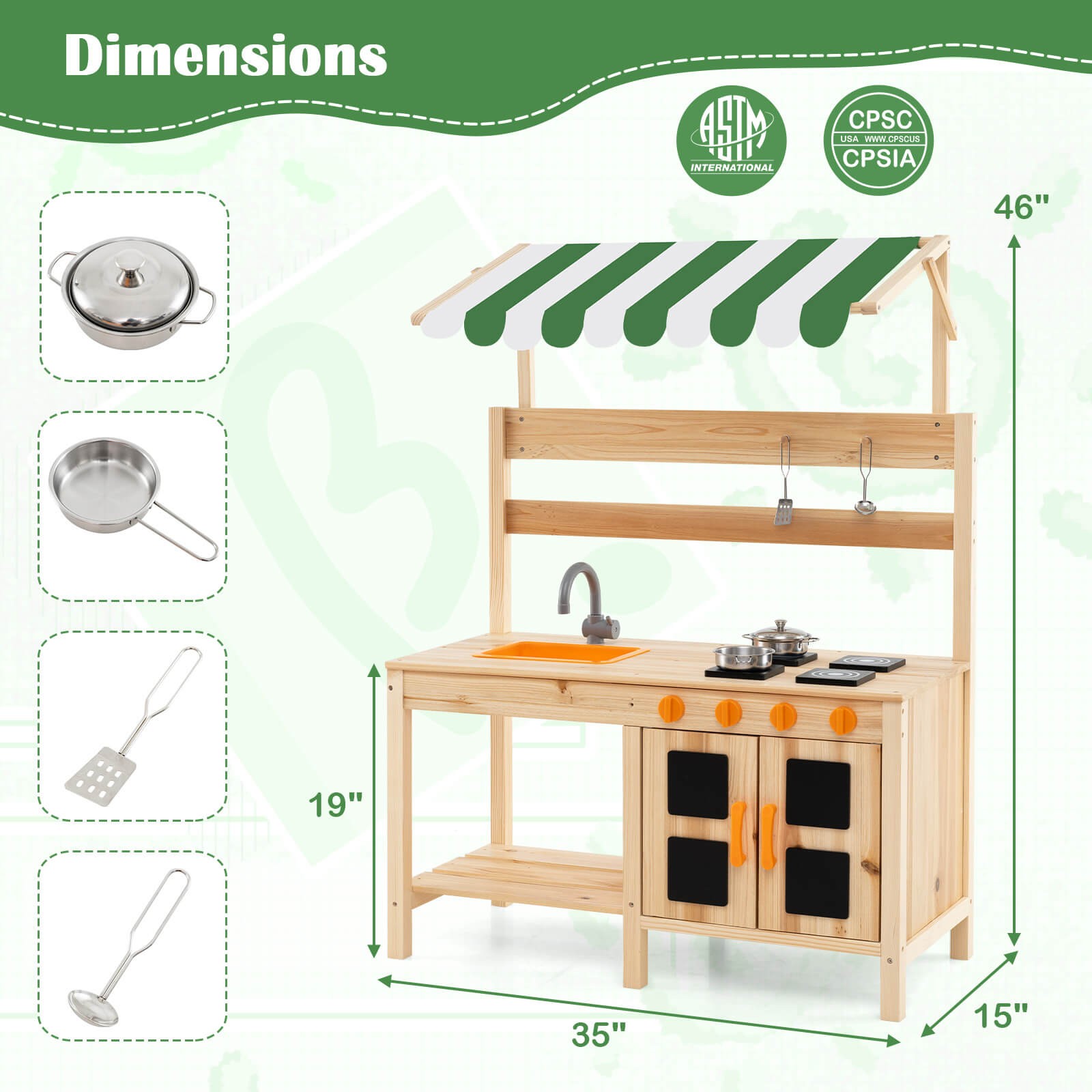 Kids Mud Kitchen Outdoor Wooden Pretend Play Kitchen w/ 4 Stoves, Canopy,Faucet