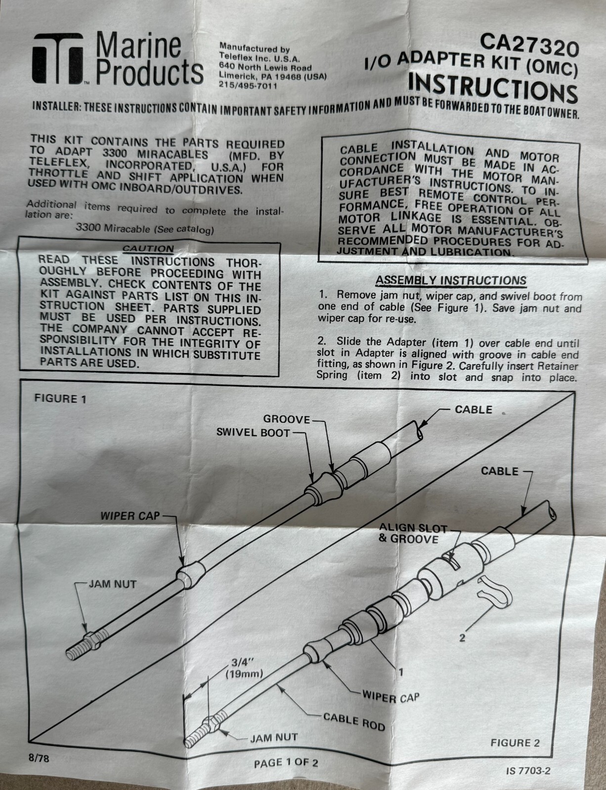TELEFLEX MARINE PRODUCTS ADAPTER KIT PART CA27320