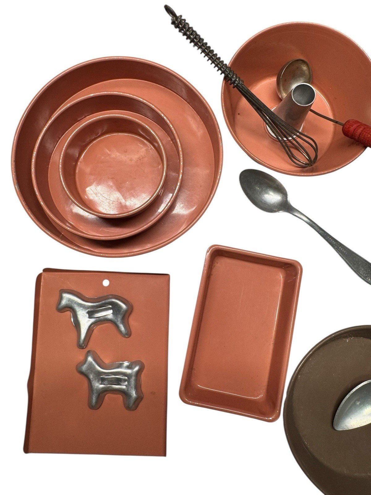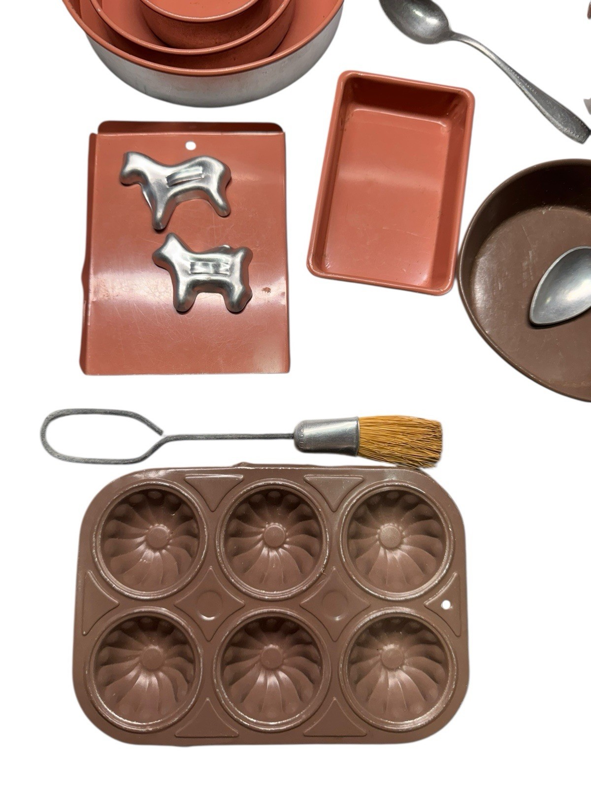 Metal Aluminum Childs Kitchen Play Set Bakeware Muffin Tins 21 Pc Pink Brown