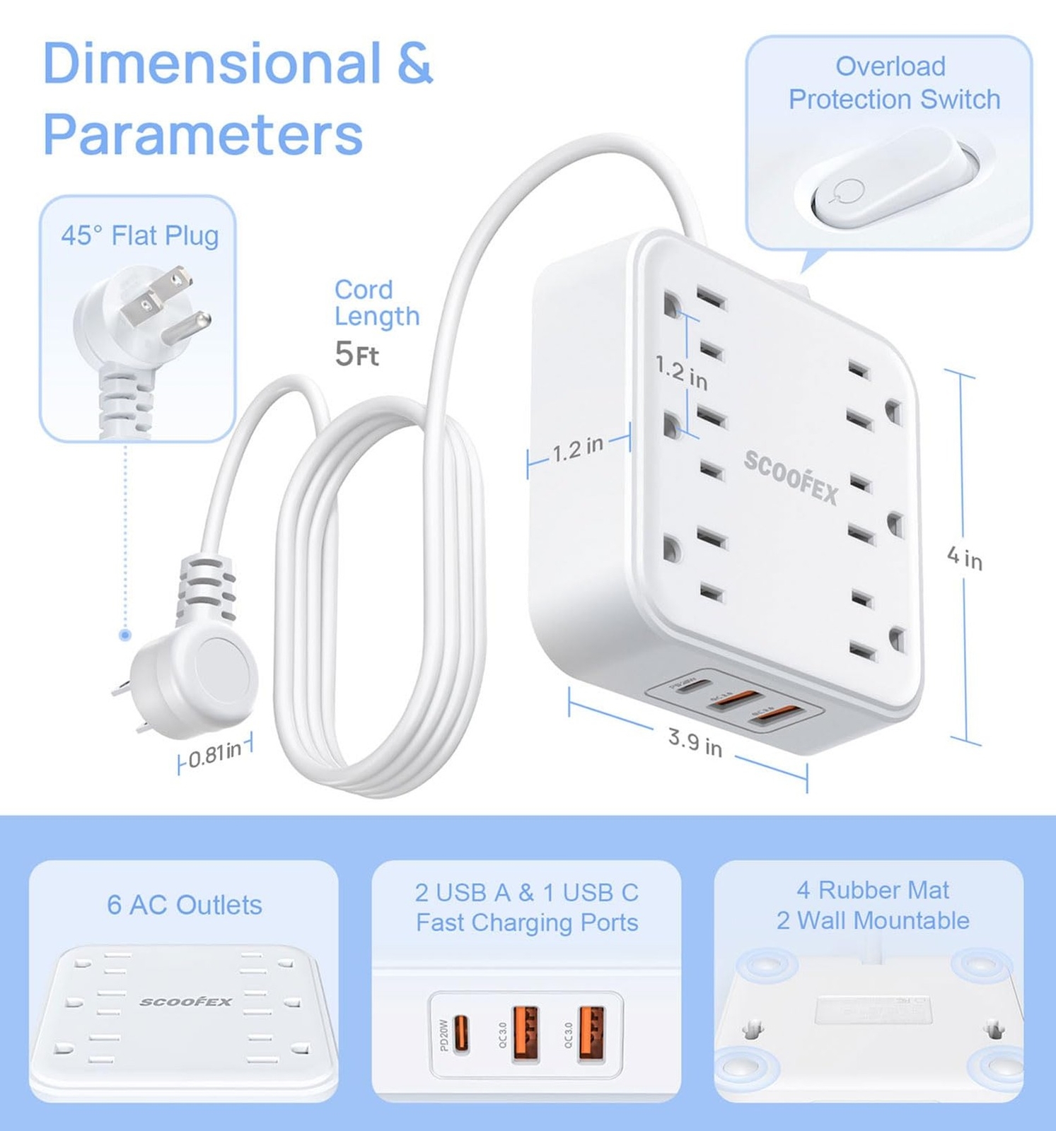 Power Strip with 20W USB Ports, 5 Ft Flat Plug Extension Cord with ... Fast Ship