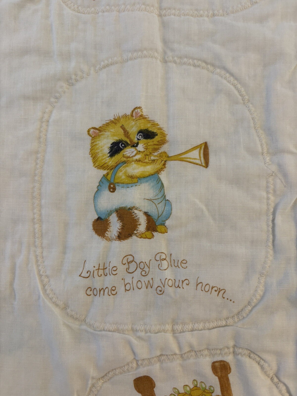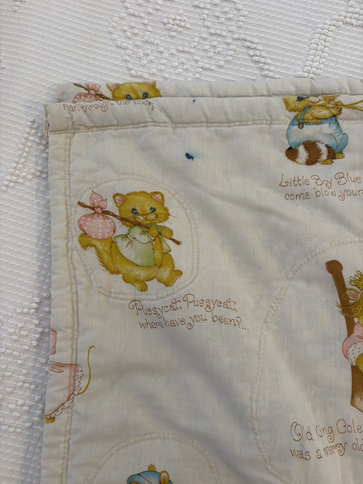 как выглядит Vintage Handmade Nursery Rhyme Quilted Baby Blanket Flaws фото
