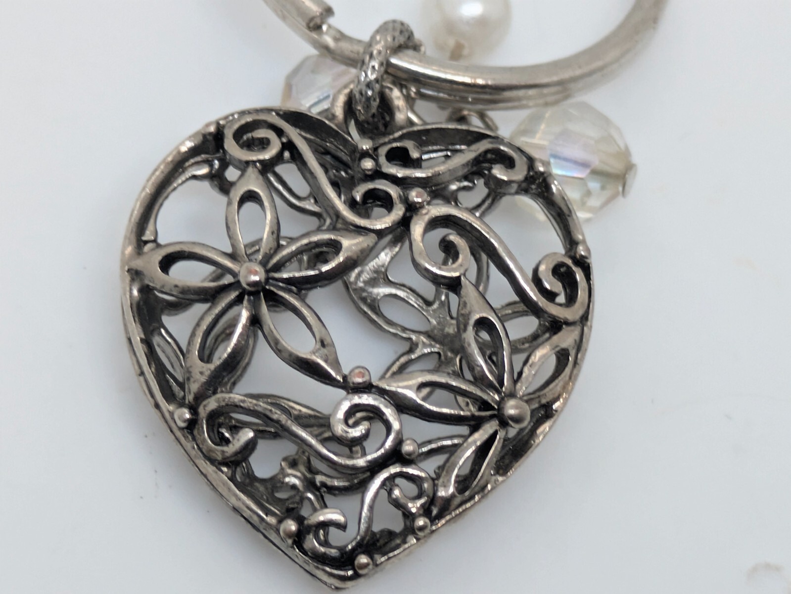 • Heart Shaped Keychain Metallic Silvertoned Wire Floral Design