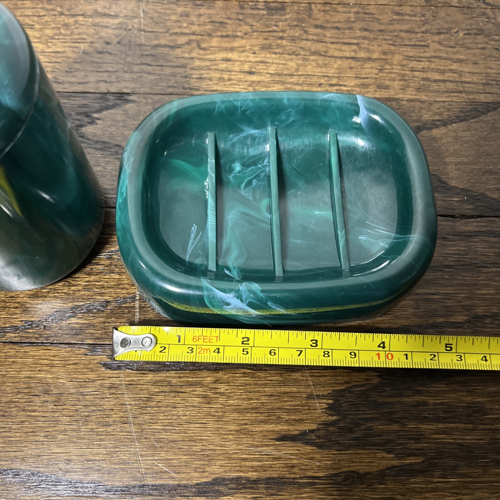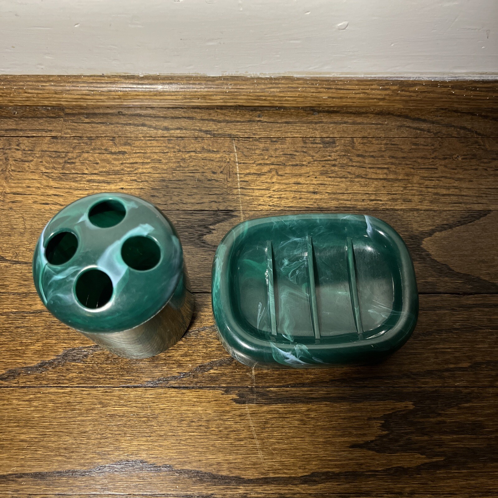 как выглядит Vtg Plastic Bathroom Soap Dish/Toothbrush Holder Set Marble Evergreen Unbranded фото