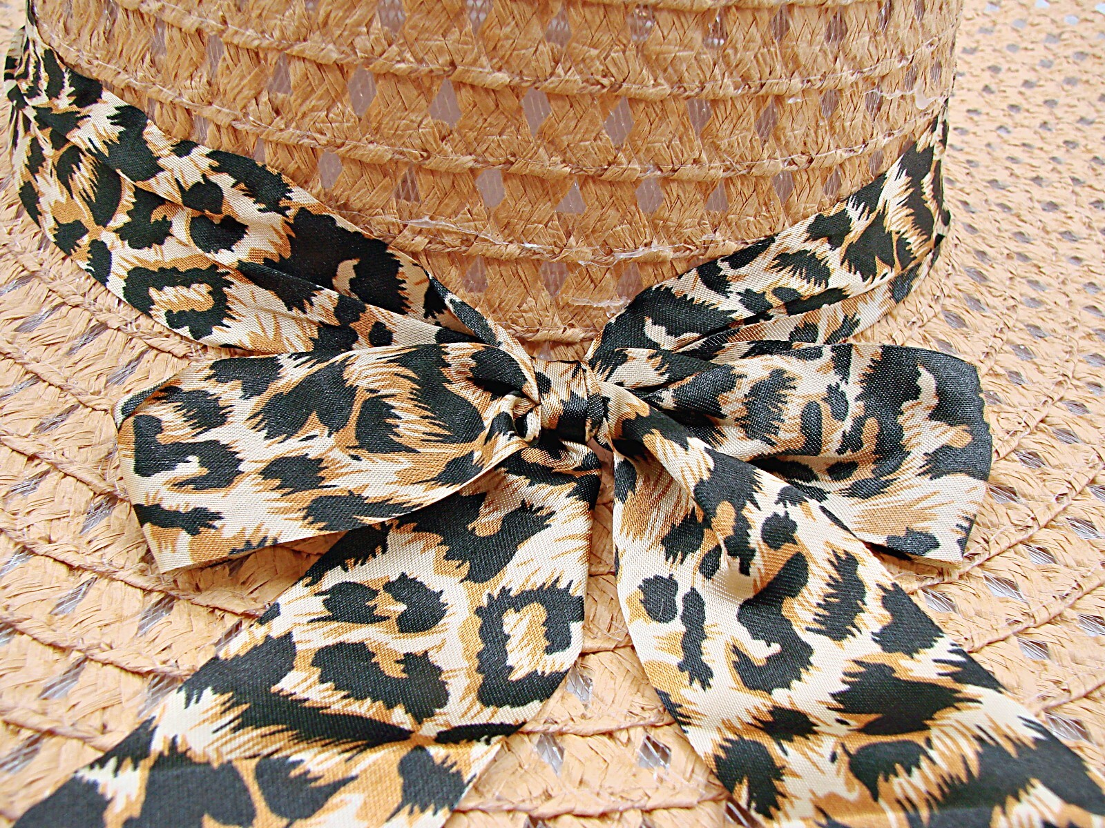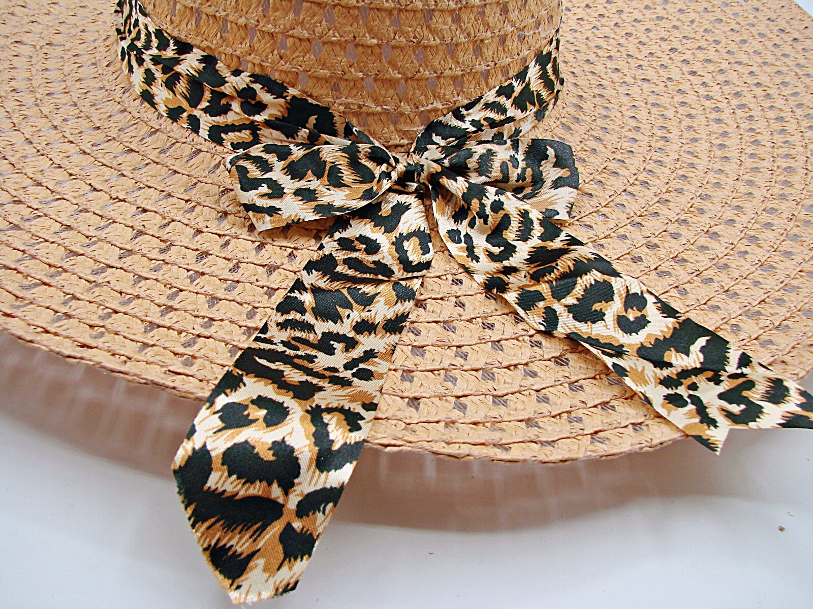 Wide Brim Sun Hat Large Beige Leopard Bow Floppy Black Band Beach Church Wedding