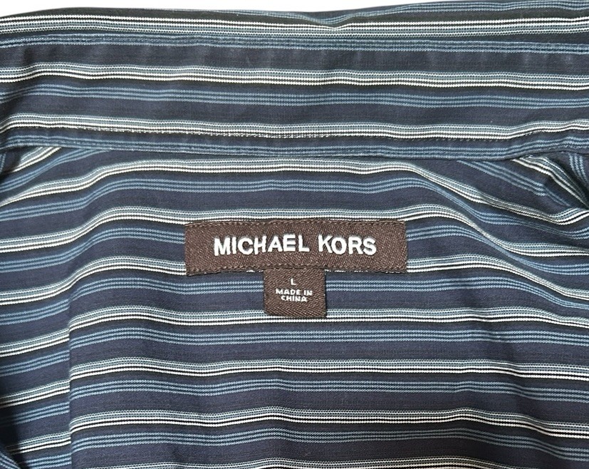 как выглядит Michael Kors Mens Cotton Button Down Navy Blue Striped Dress Shirt Large фото