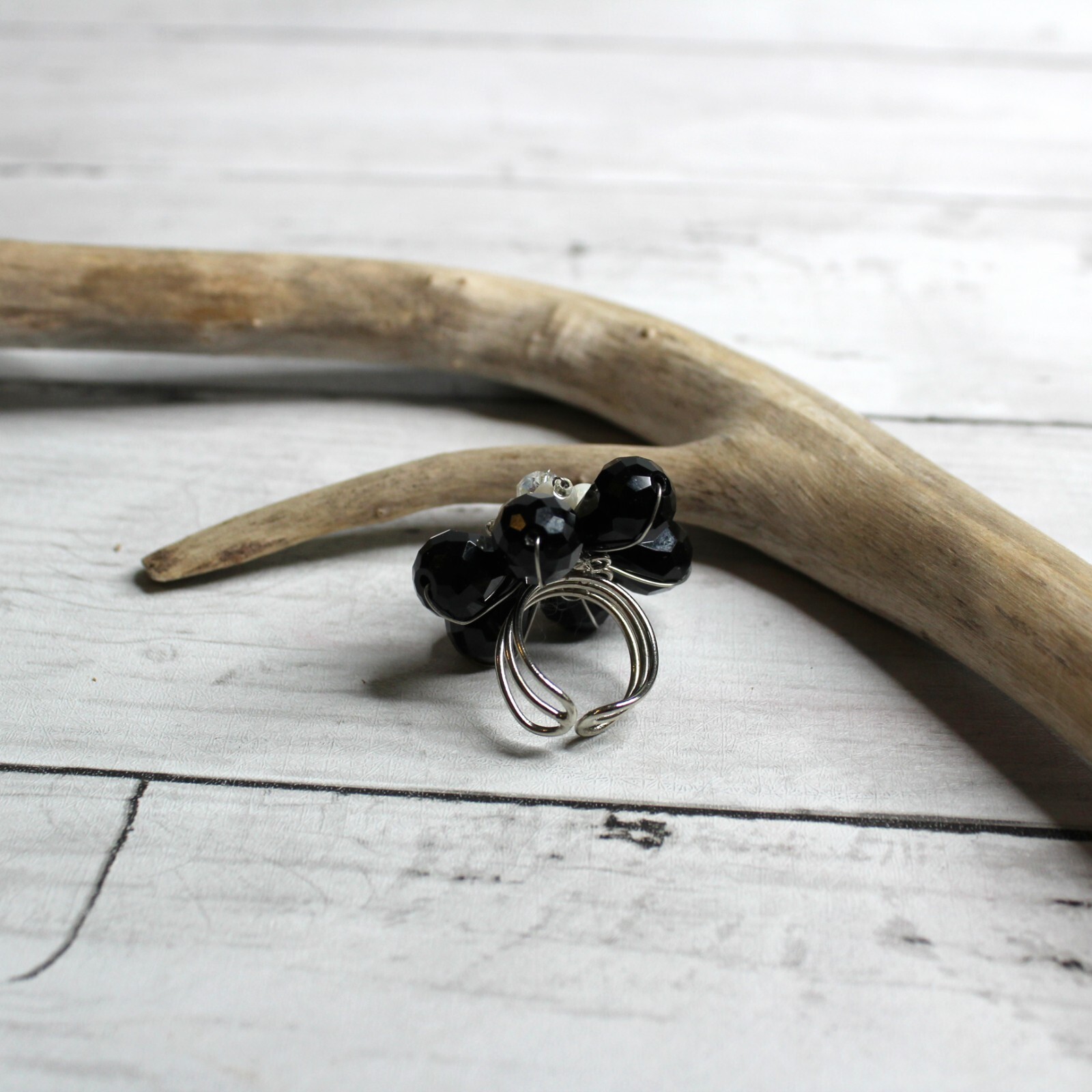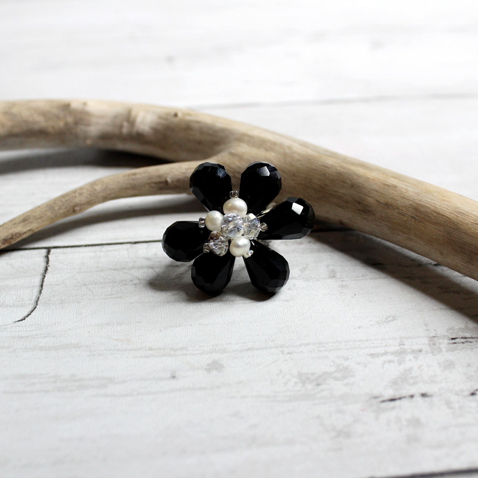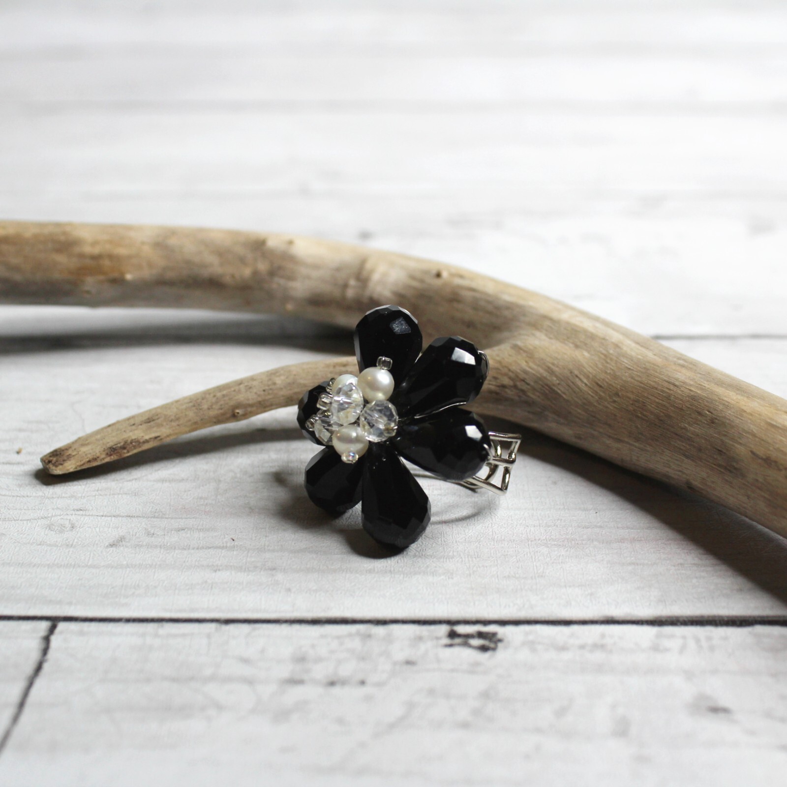 Handcrafted Women's Black Flower Ring White Cultured Pearls Artisan Jewelry