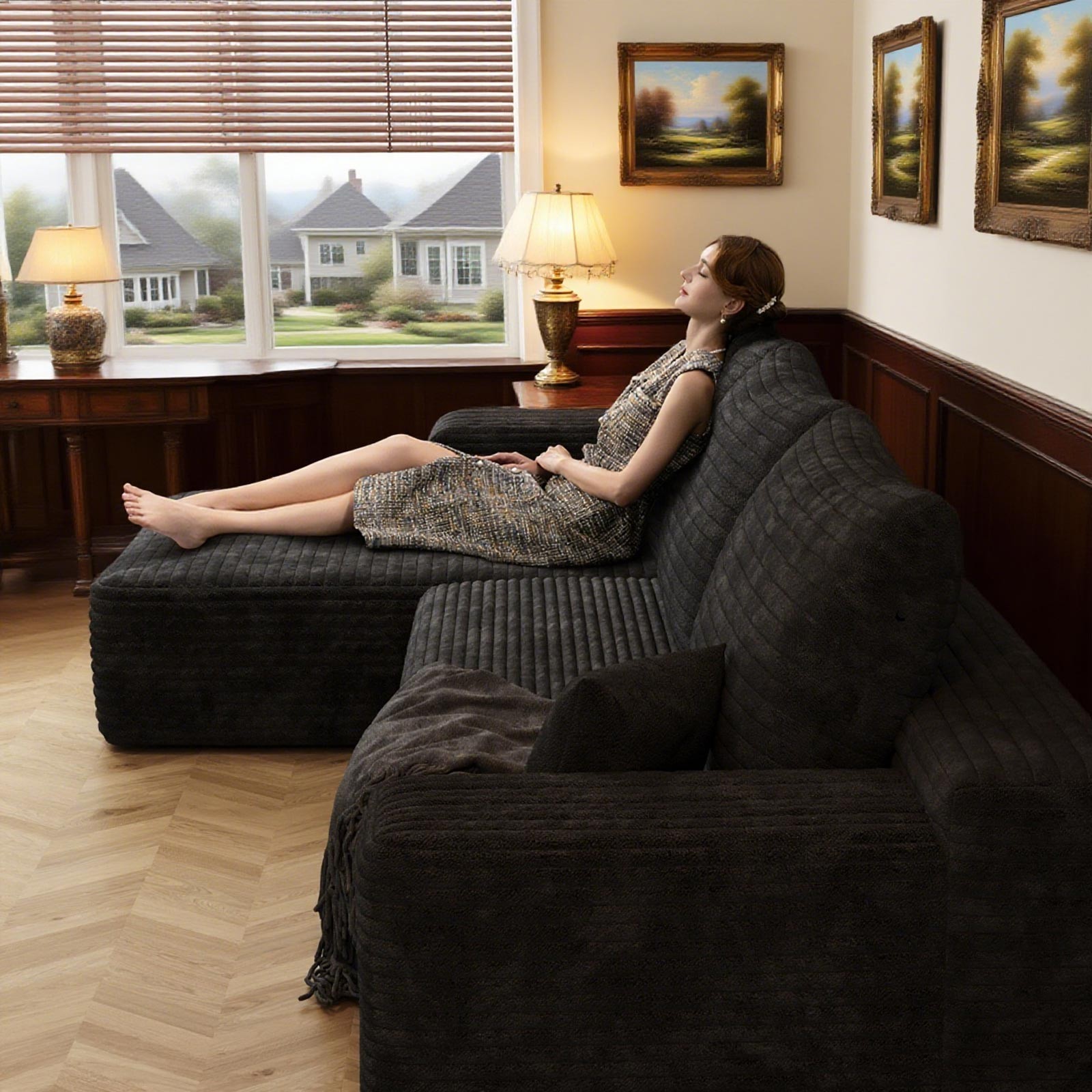 107Black Plush L Shaped Sectional Couch Corduroy Boneless Sofa with Left Chaise