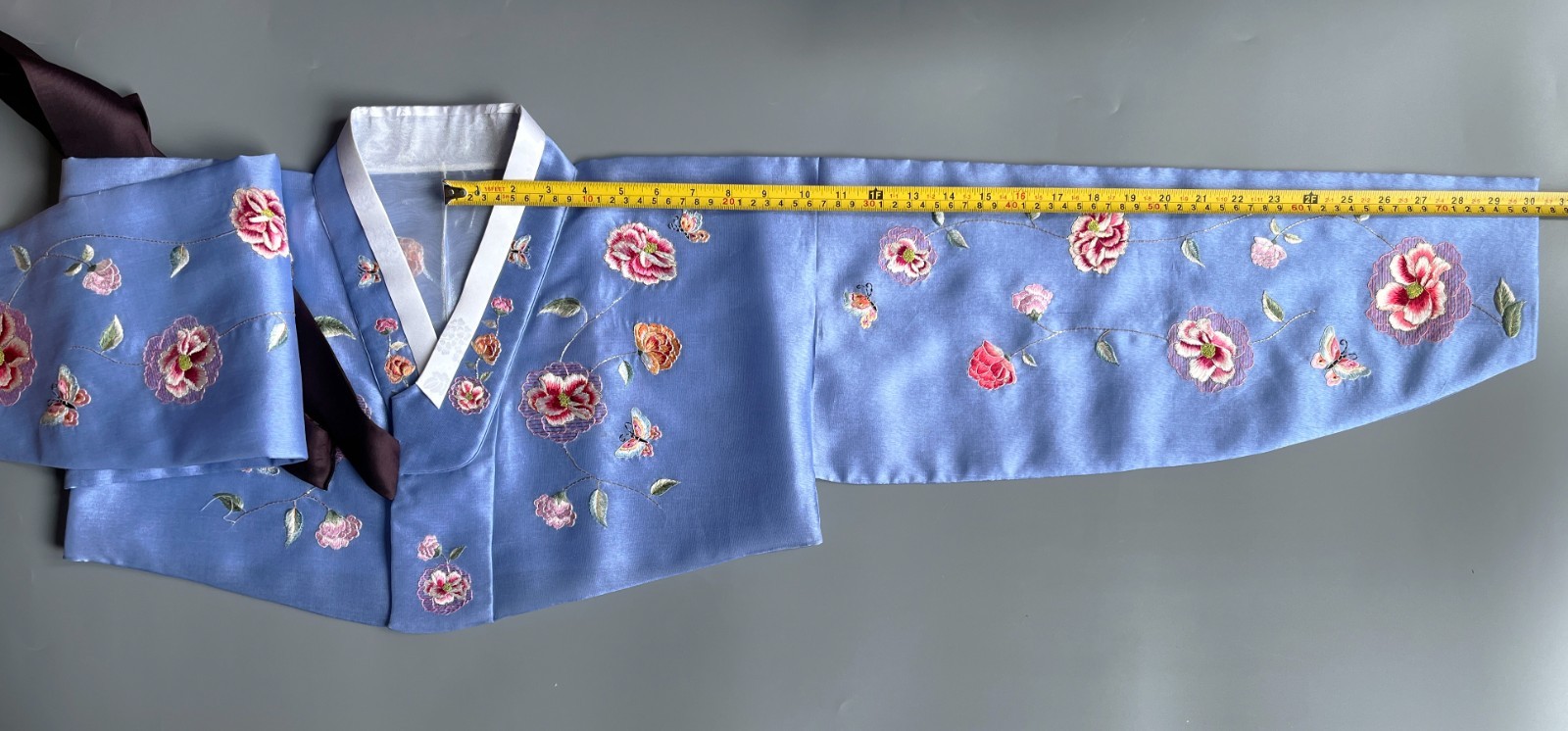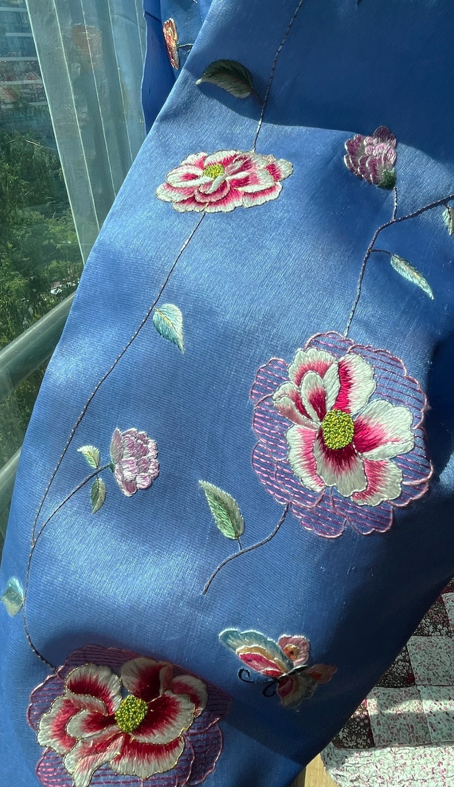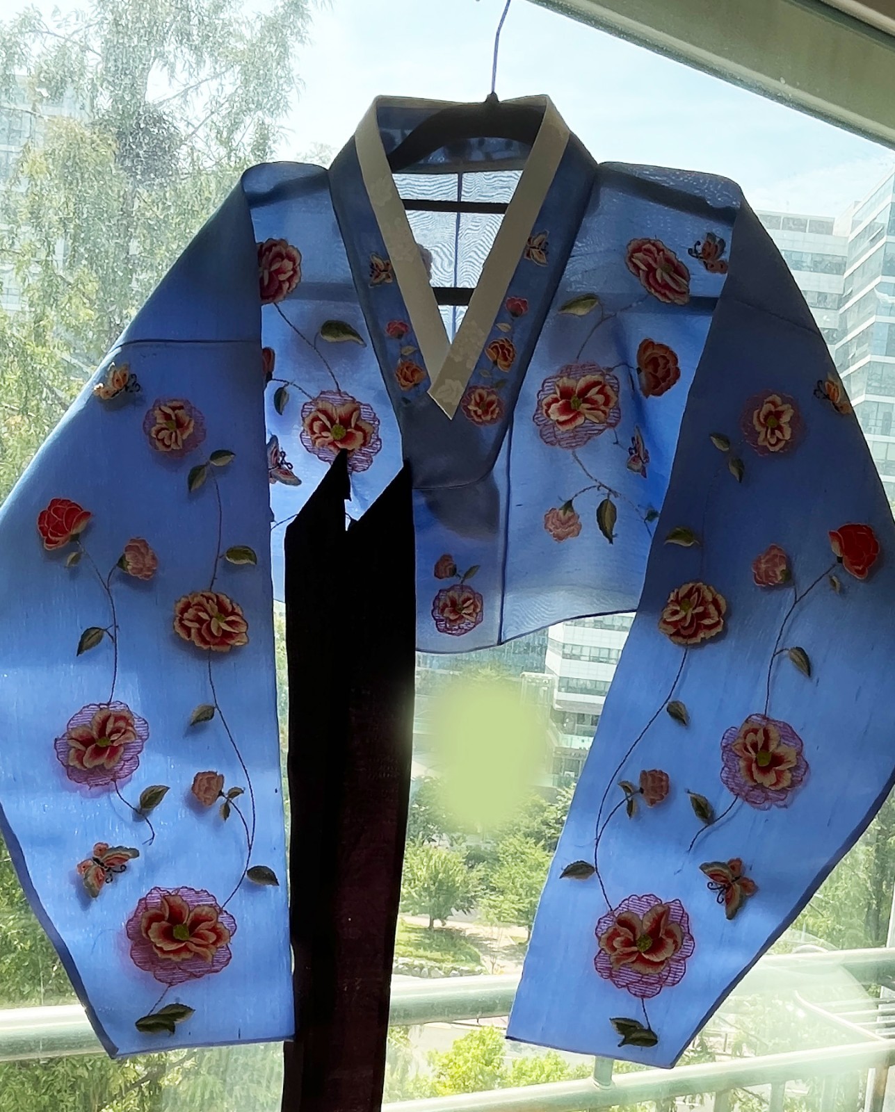Large Size Peony Butterfly Charm Hand-Embroidered Sky Blue Silk Hanbok Jacket