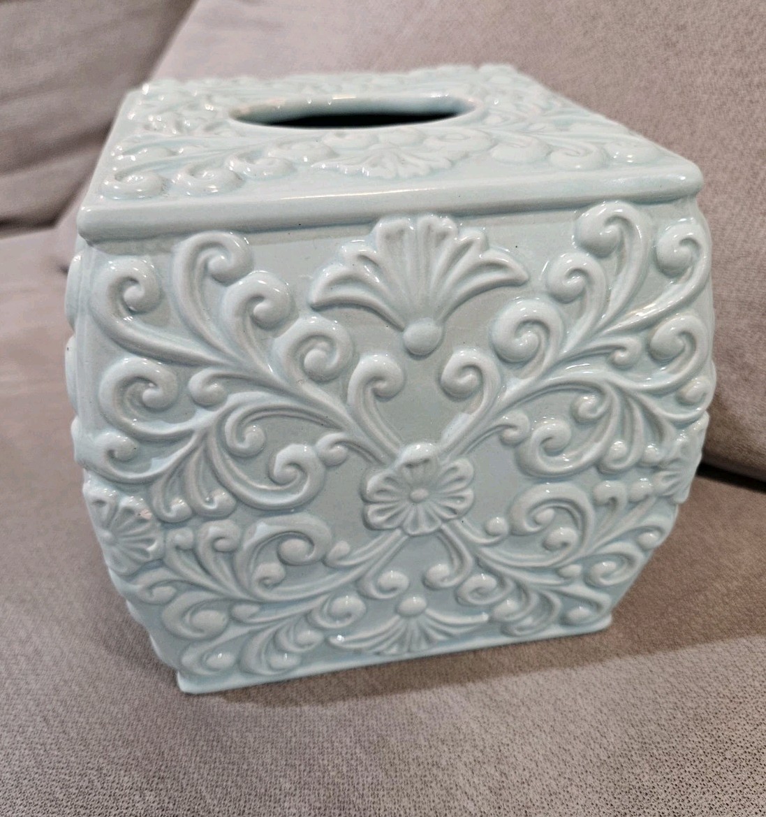 Raymond Waites 3D Textured Floral Ceramic Tissue Cover Teal Blue Set Turquoise