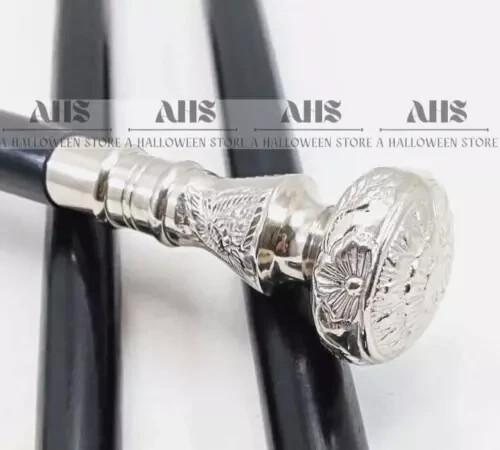 Vintage Antique Silver Brass Handle Knob Black Wooden Shaft Walking Stick