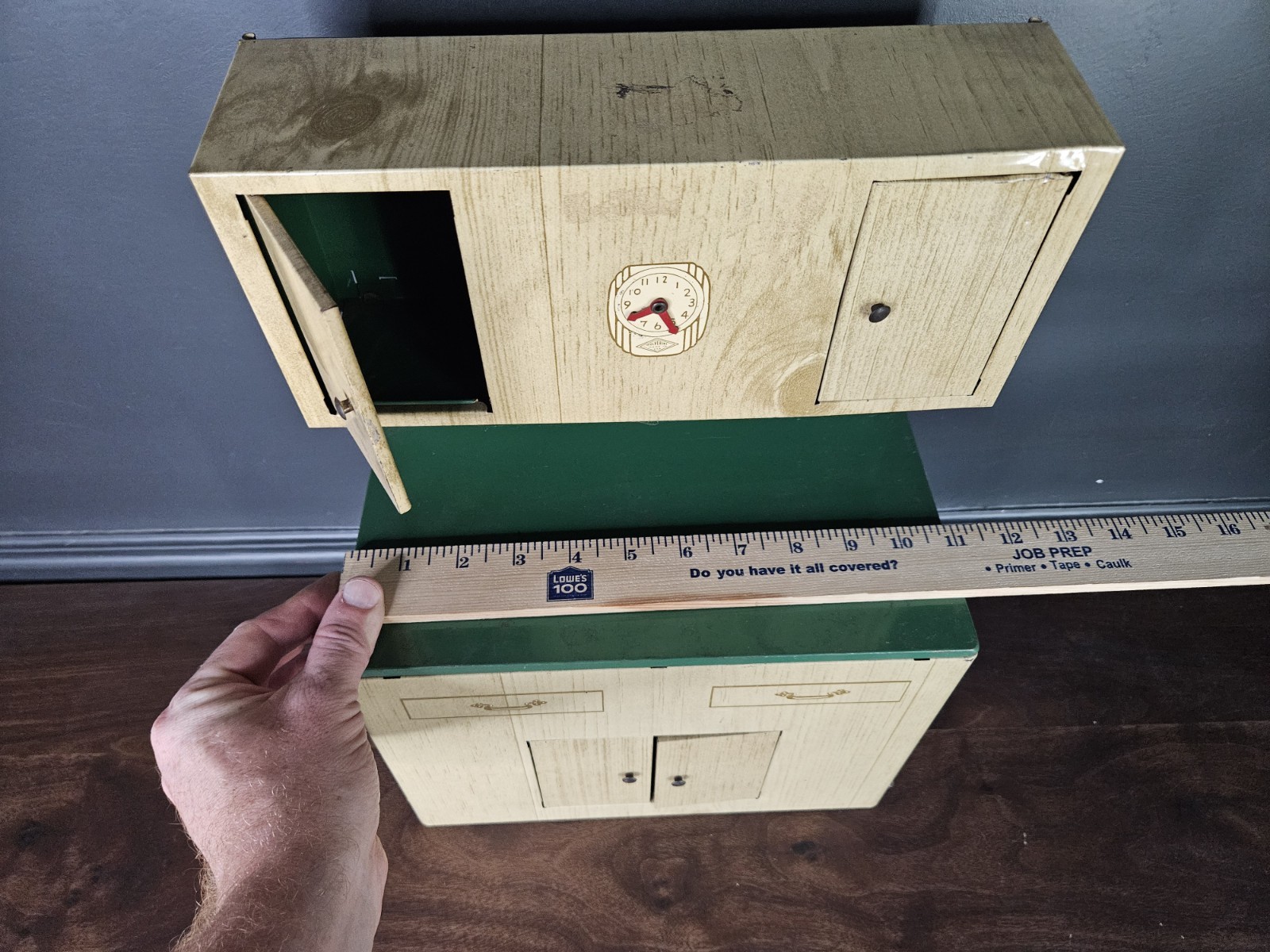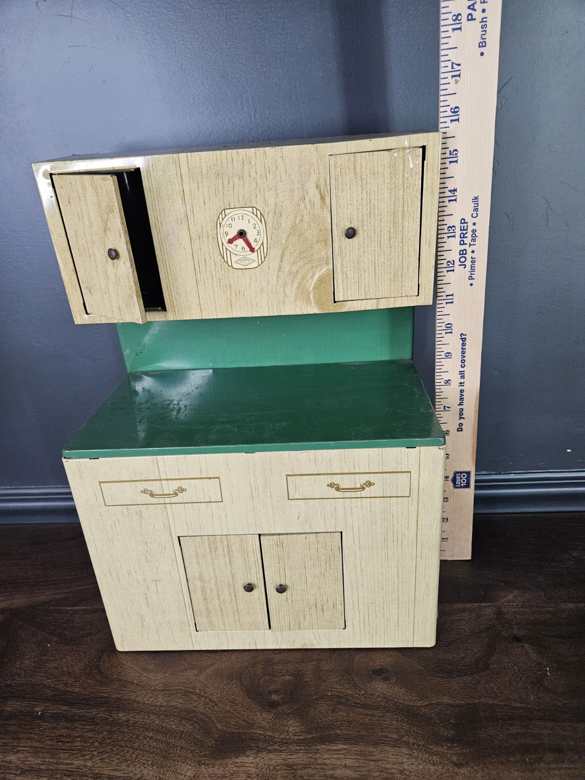 VTG 1950s Wolverine Tin Wood Look Kitchen Hutch Green Wood Tone Cabinet Toy