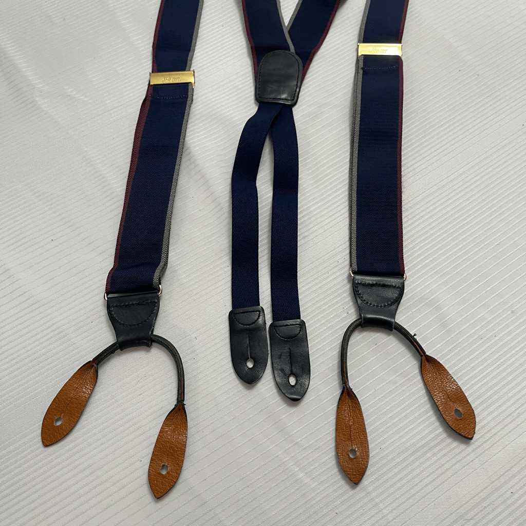 Cole Haan VTG Navy Blue Solid Brass Suspenders Black Brown Leather Braces
