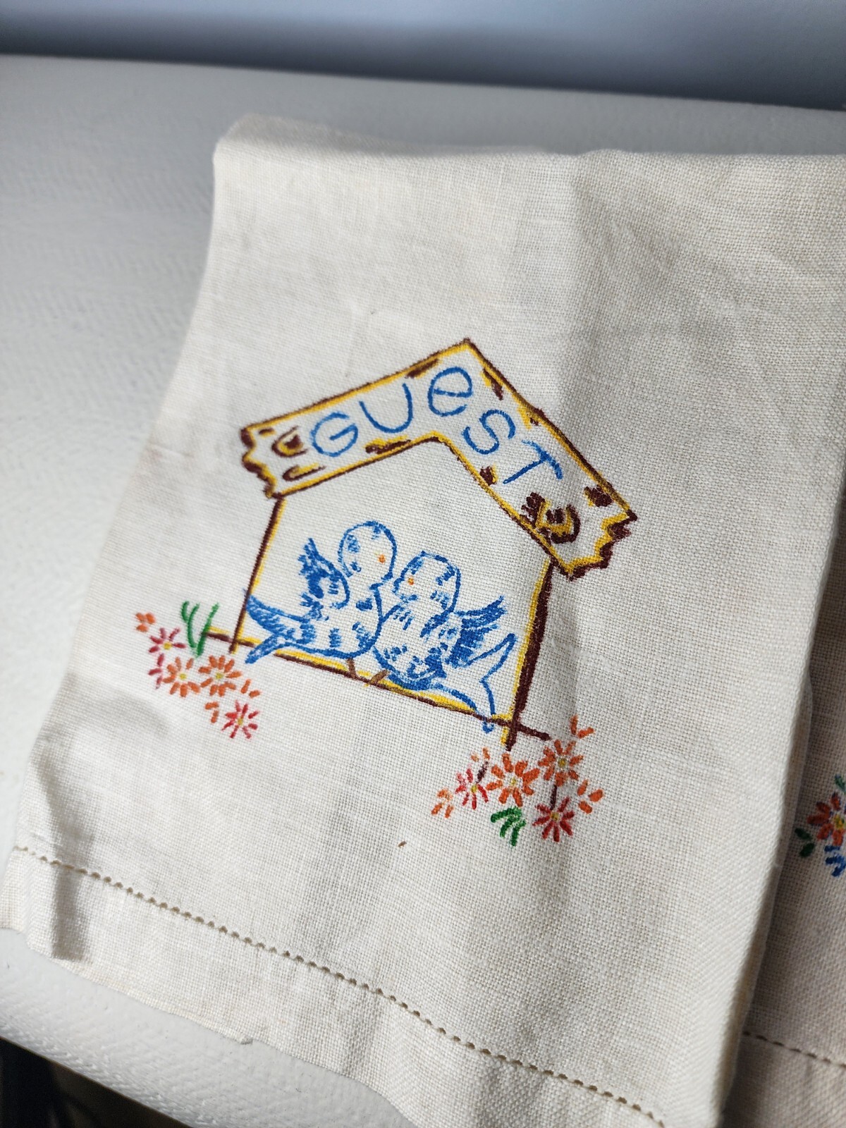 • Vintage Set of Two Printed Tea Towels Kitchen Guest Bath Birdhouse