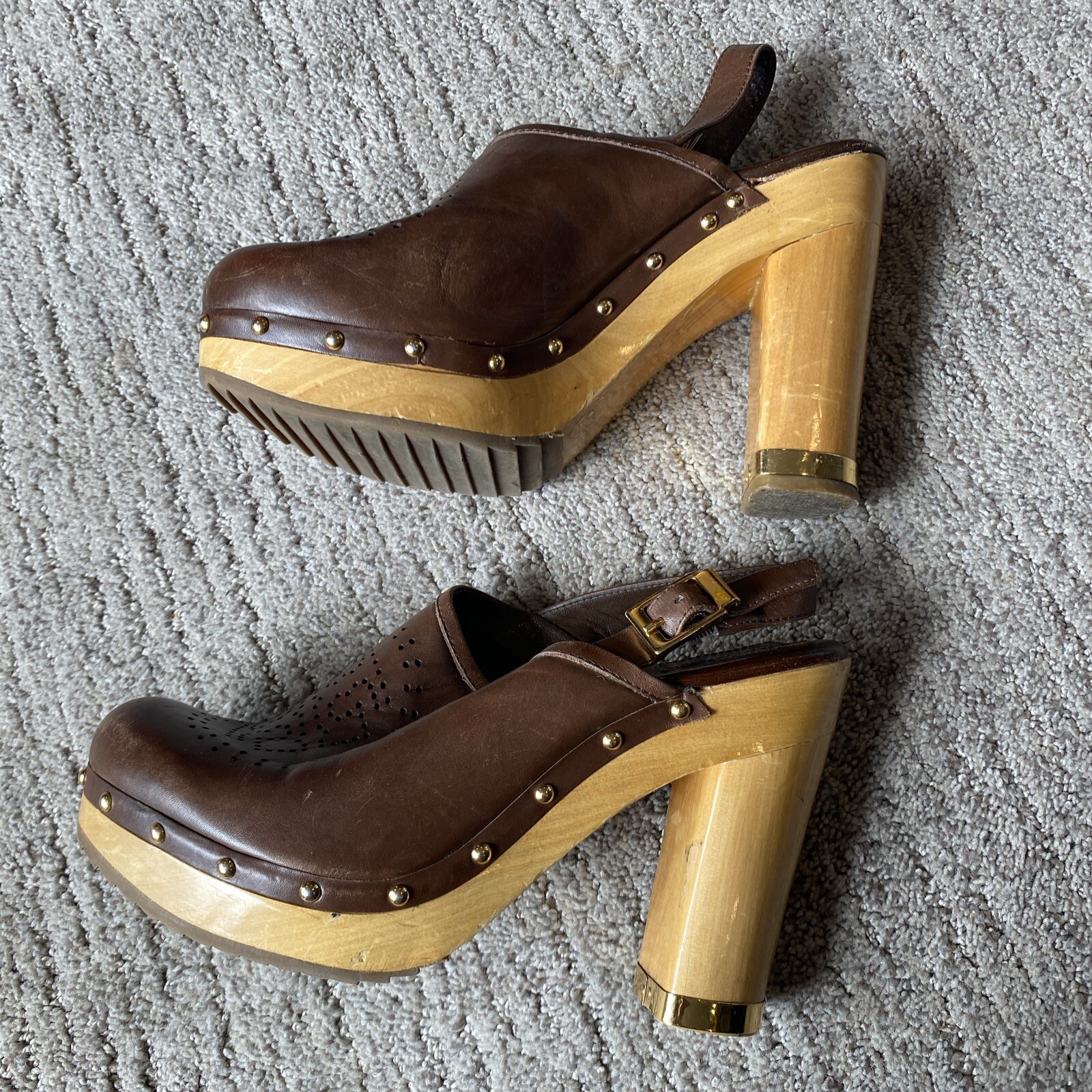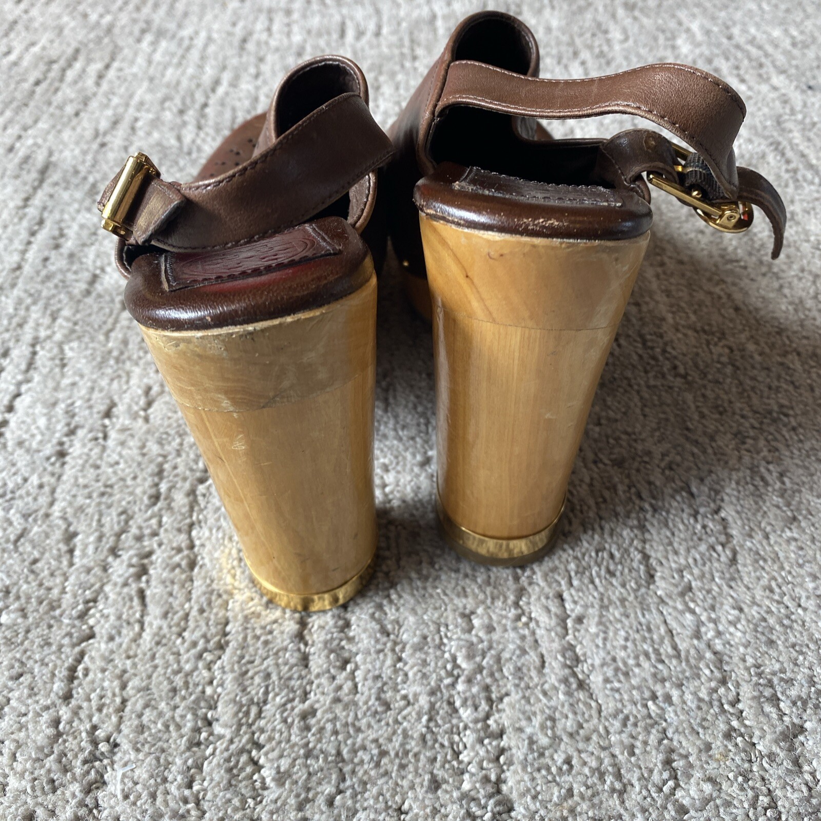 как выглядит TORY BURCH Brayden Wooden Heels Brown Leather Clogs Shoes Perforated Logo-Size 8 фото