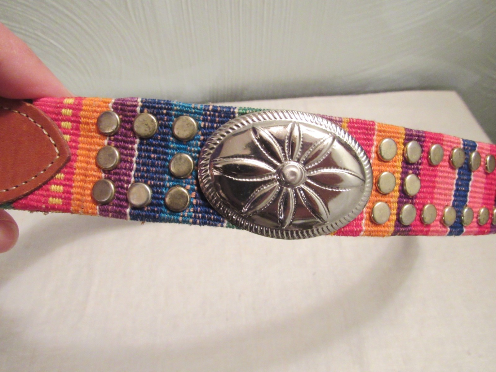 VTG Express Leather Aztec Print Belt W/ Metal Conches M Western Boho Southwest