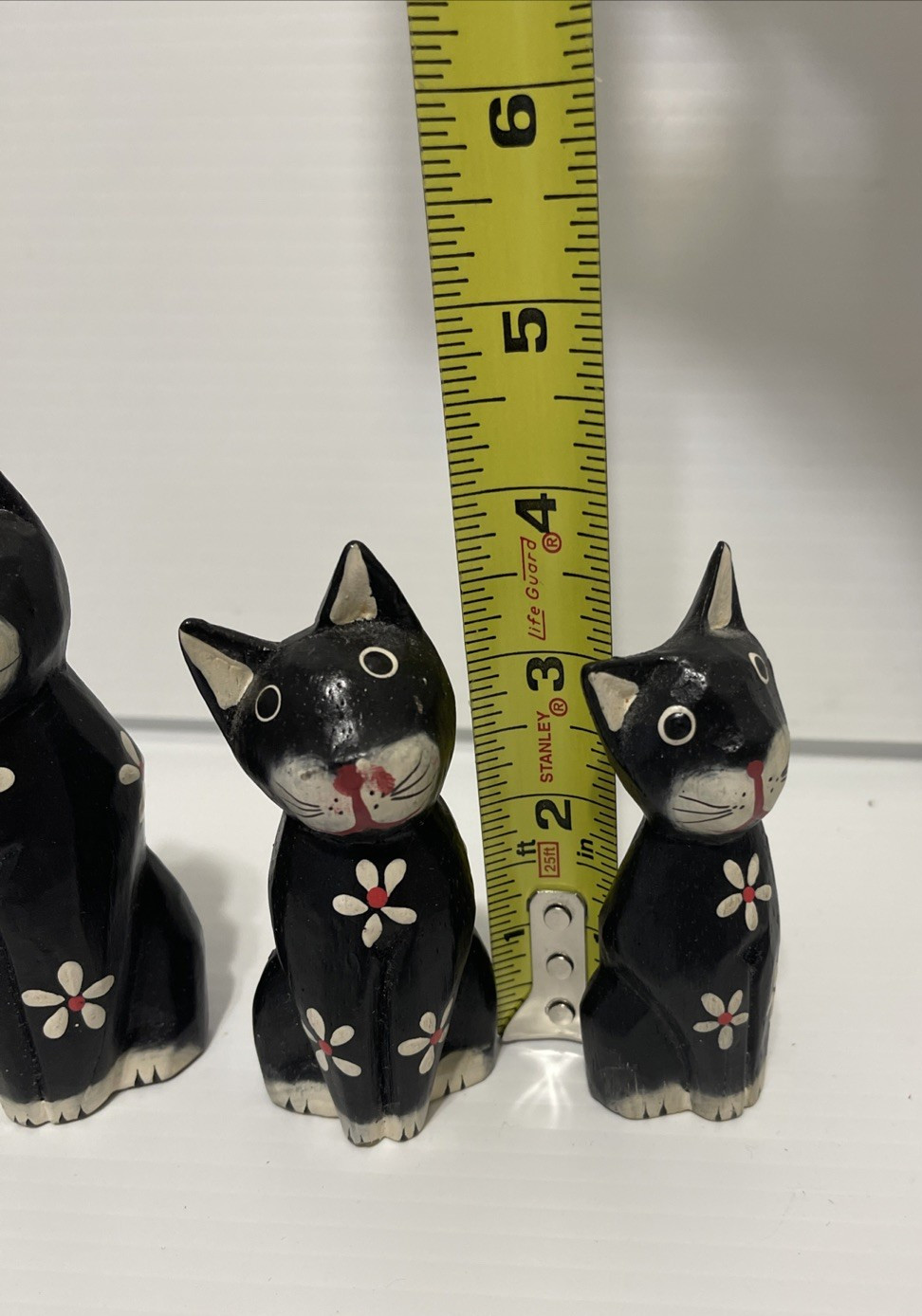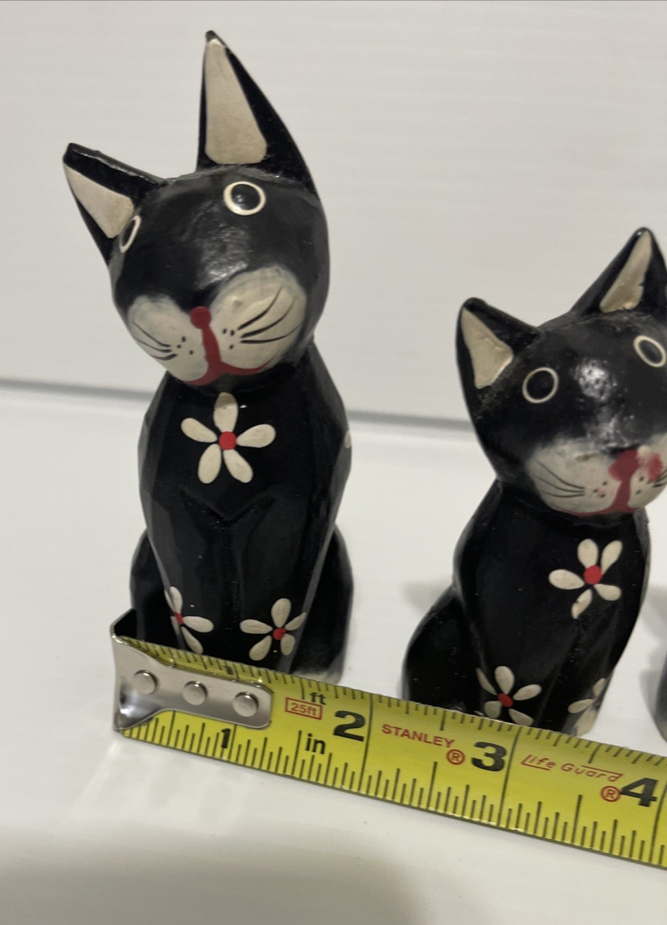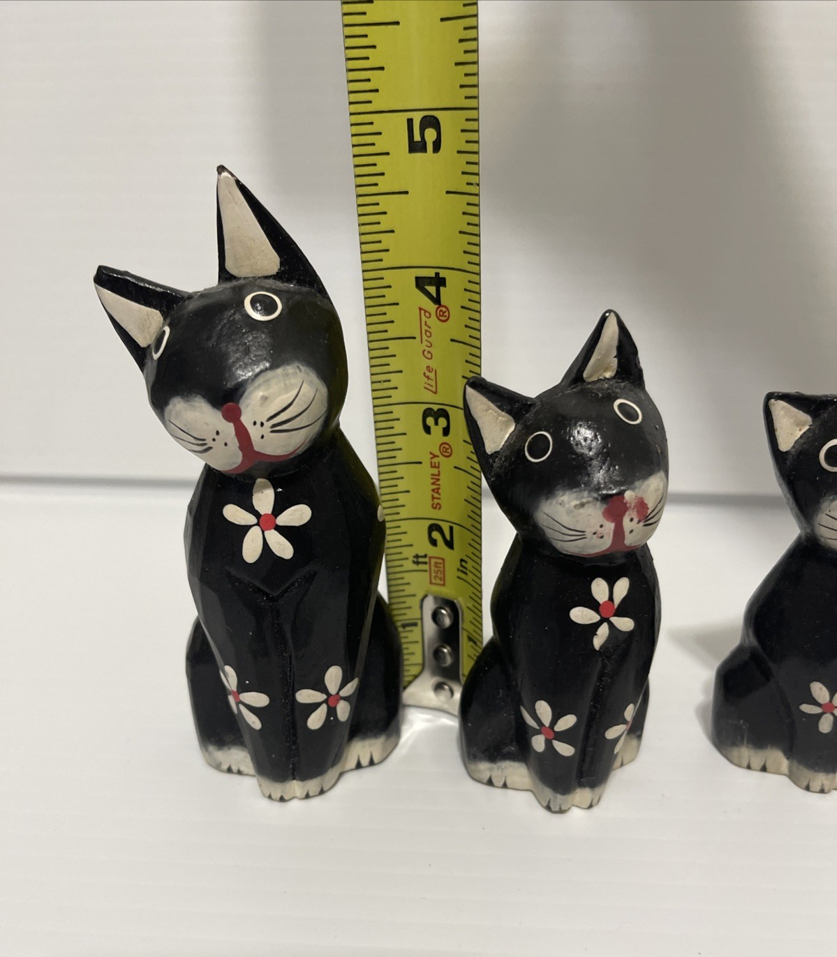 как выглядит Hand Painted Cat Figurine Set Of 3 Wood Black And White Floral Boho Folk Art фото