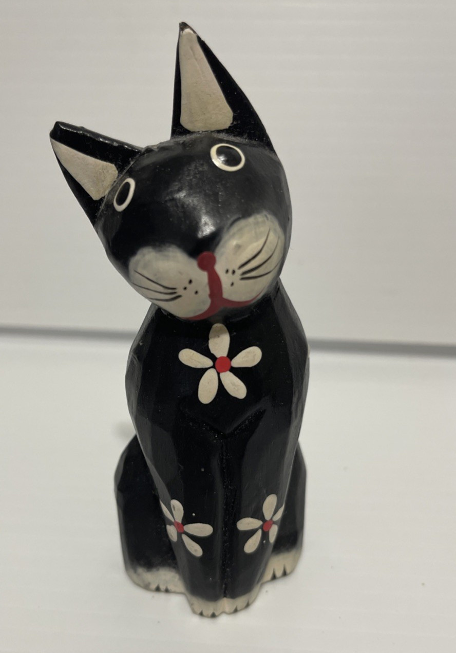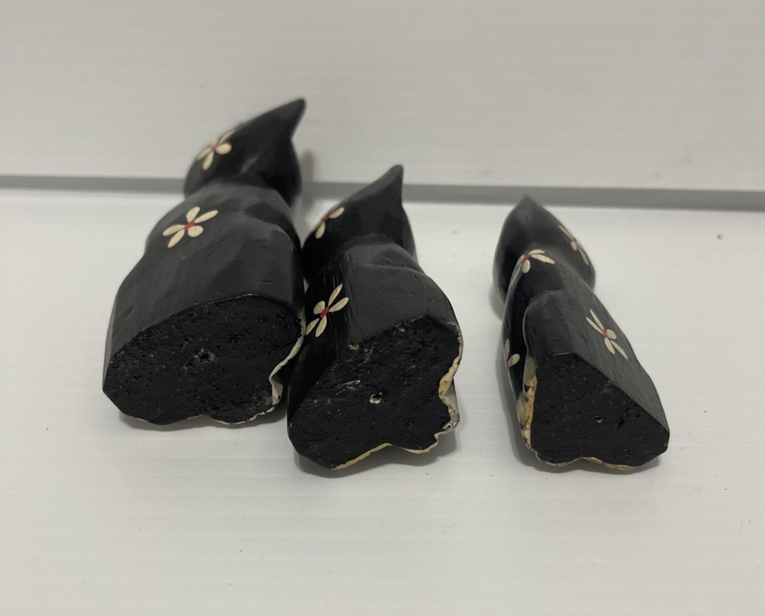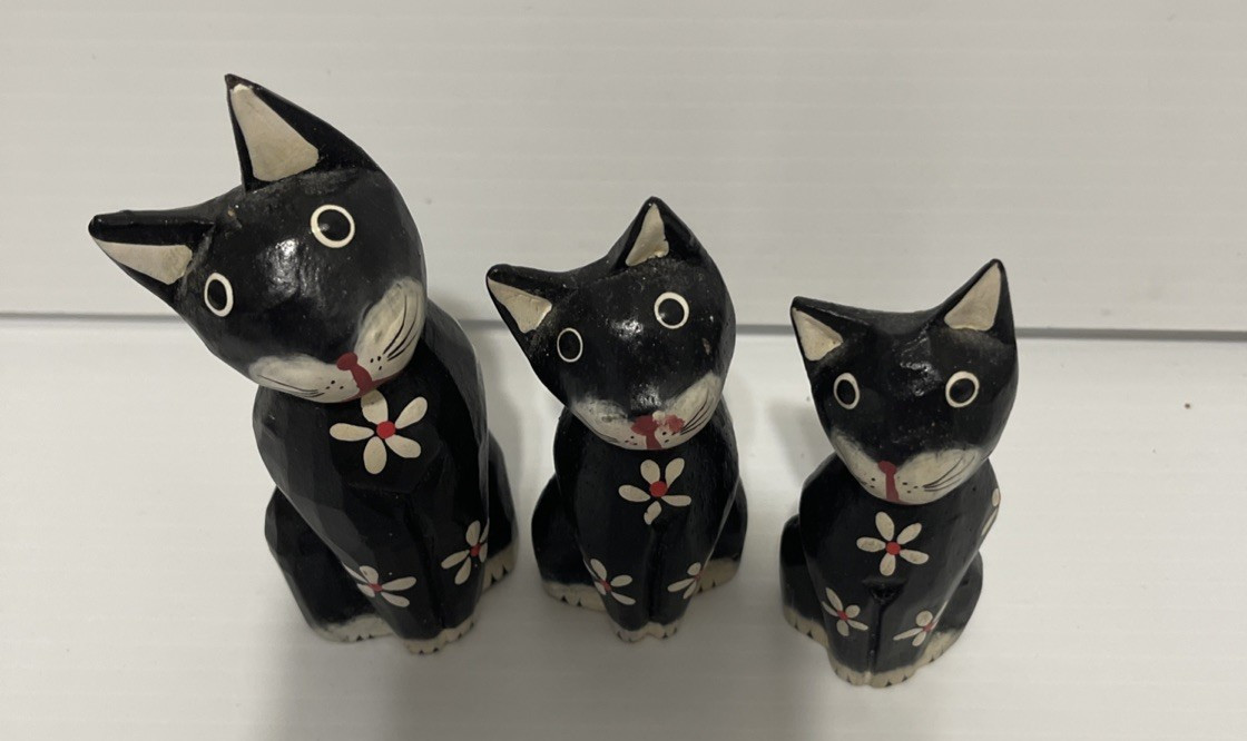 • Hand Painted Cat Figurine Set Of 3 Wood Black And White Floral Boho Folk Art
