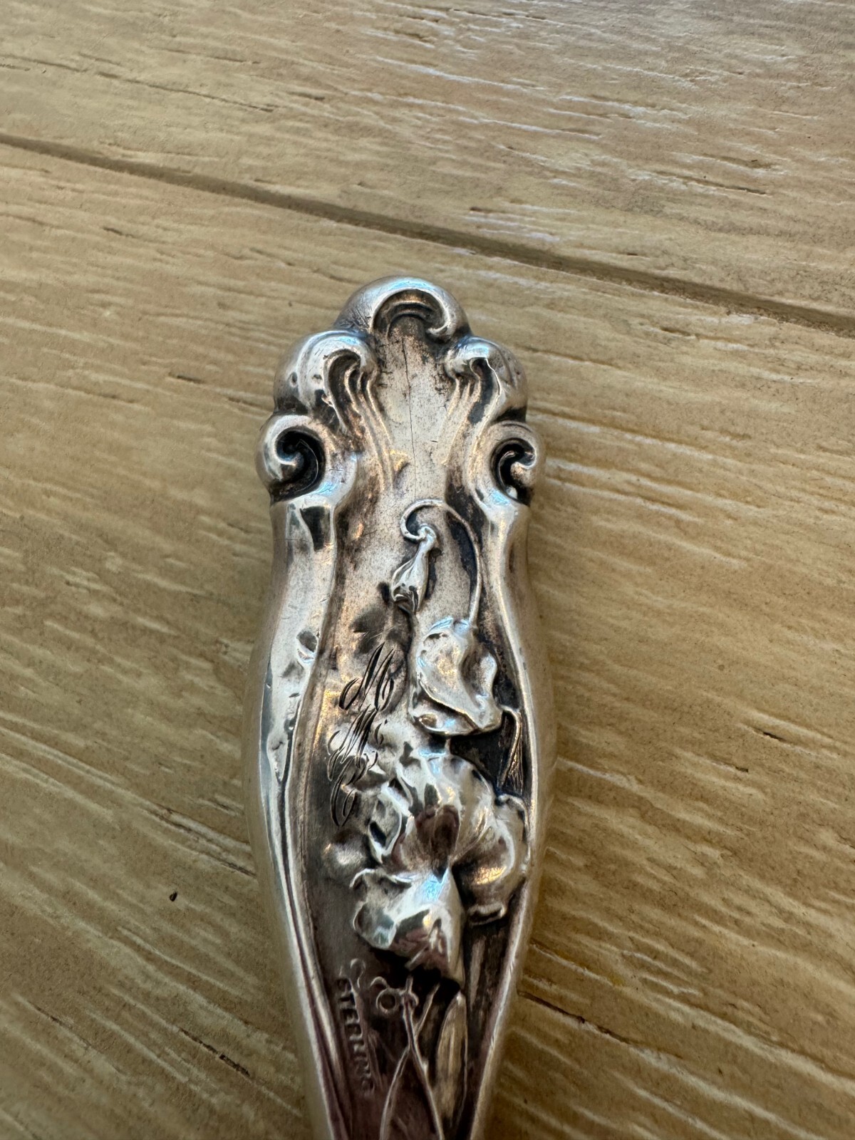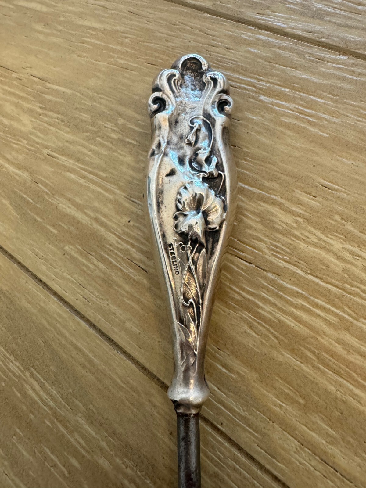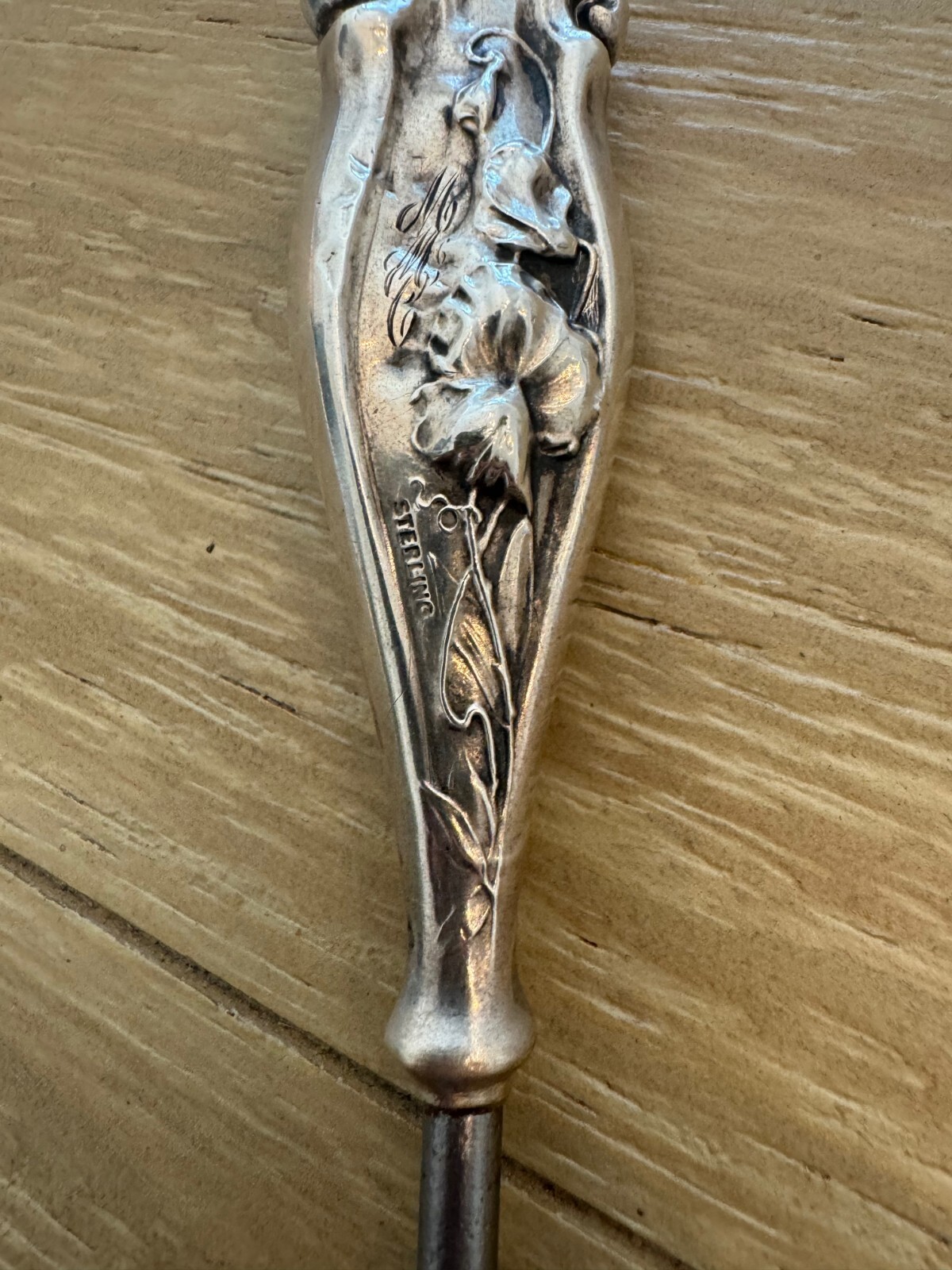 как выглядит Antique Sterling Silver Handle Button Hook Art Nouveau Flower Design Monogram фото