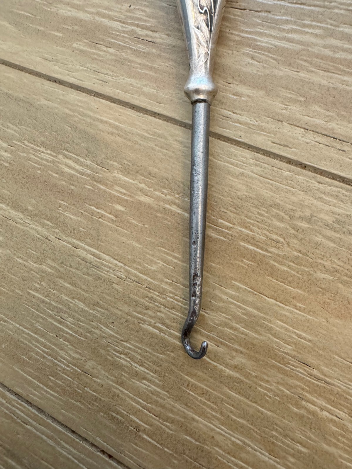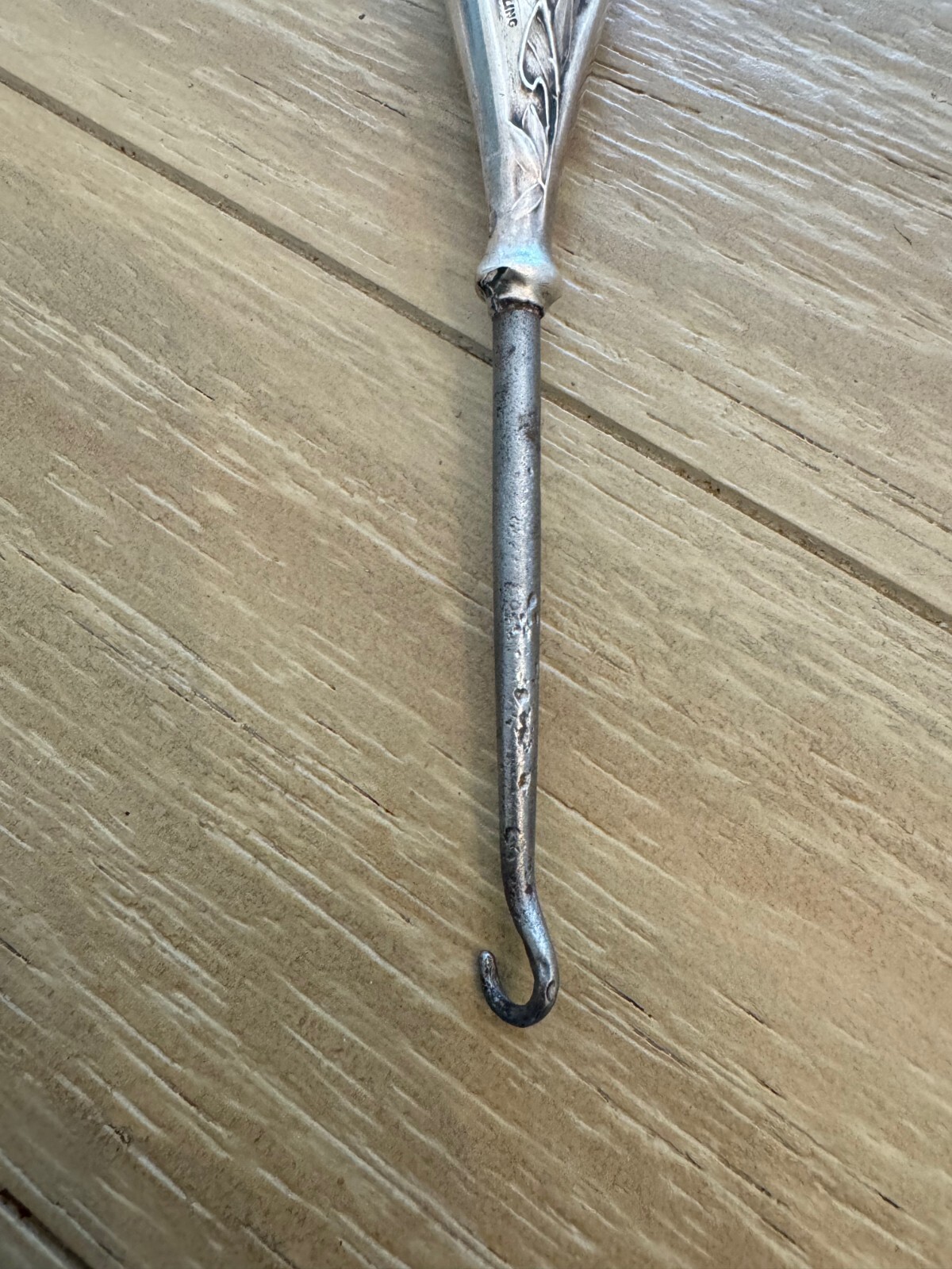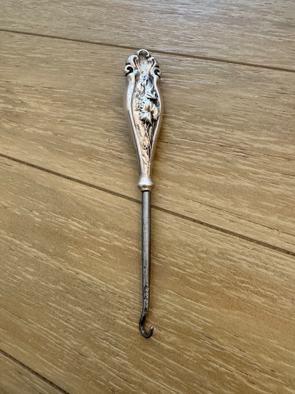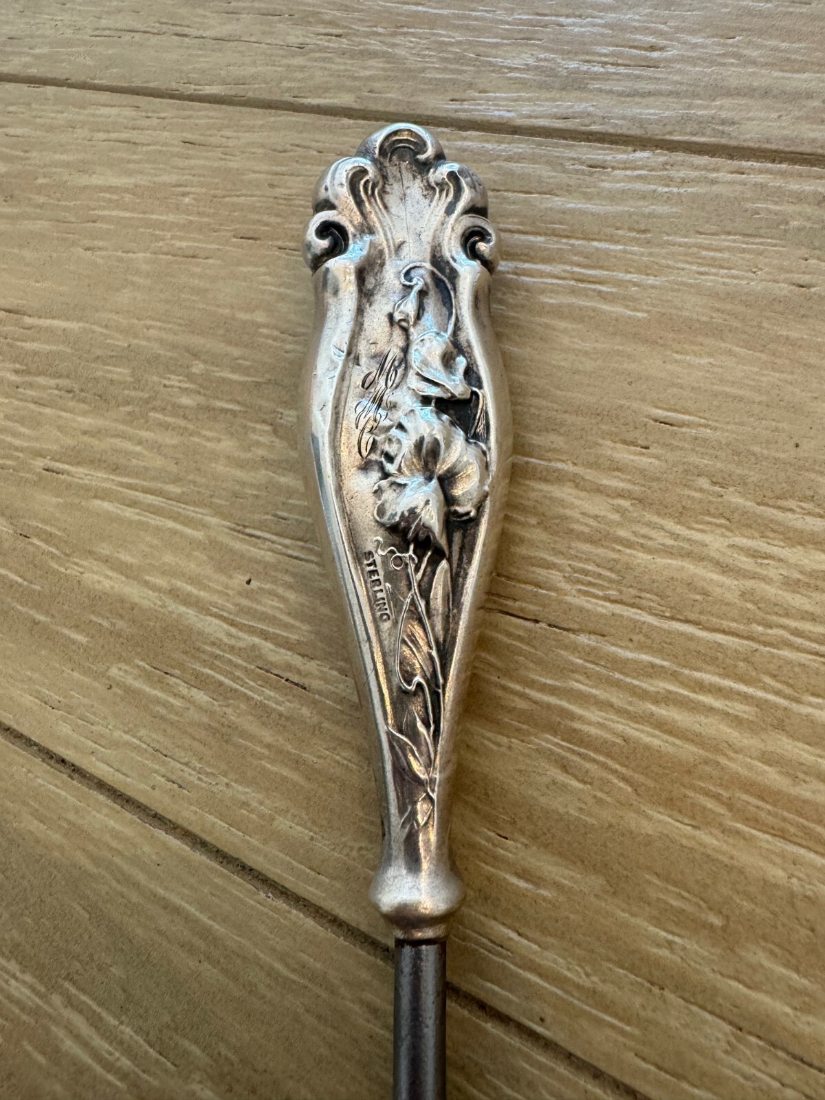 • Antique Sterling Silver Handle Button Hook Art Nouveau Flower Design Monogram