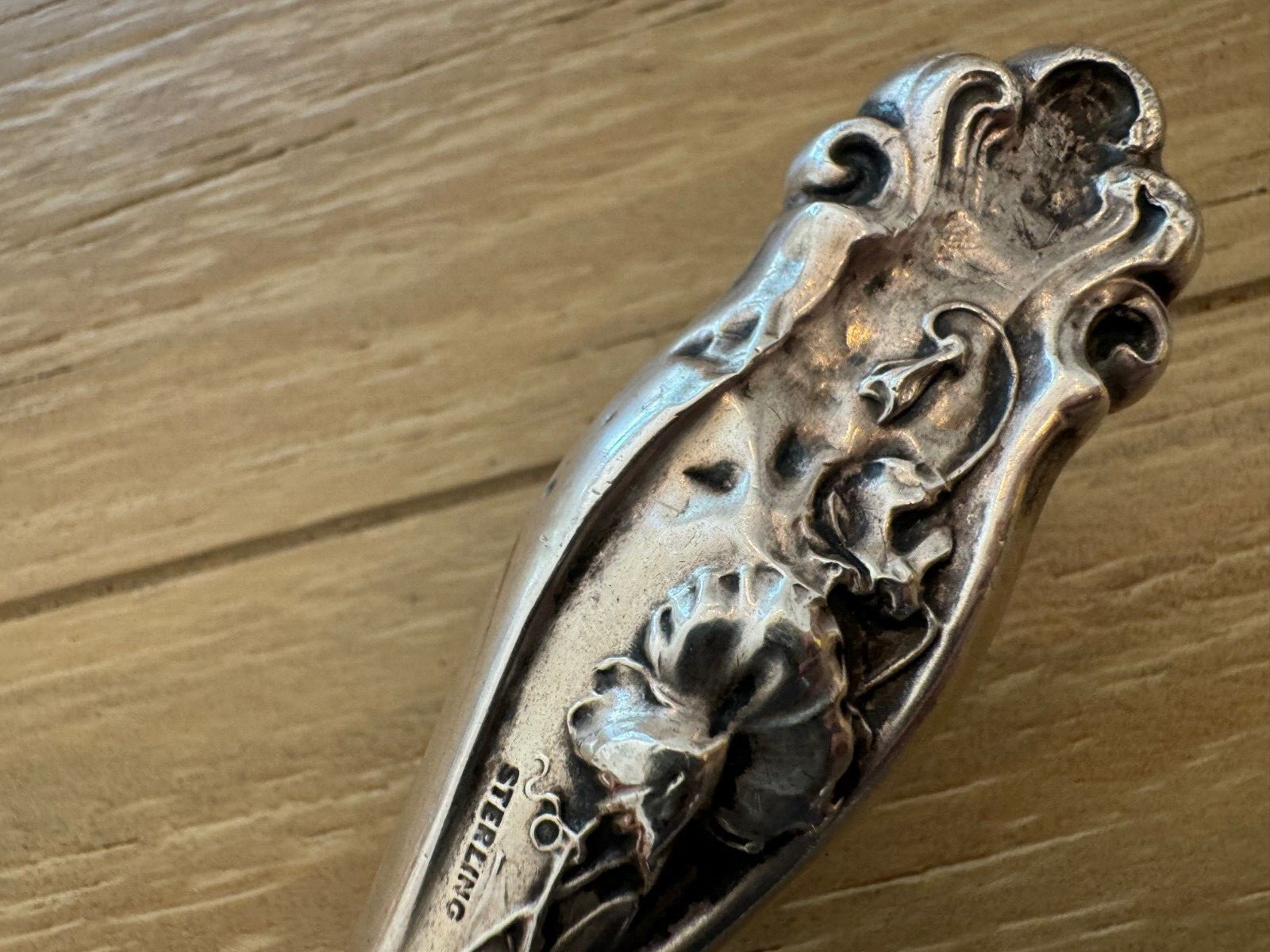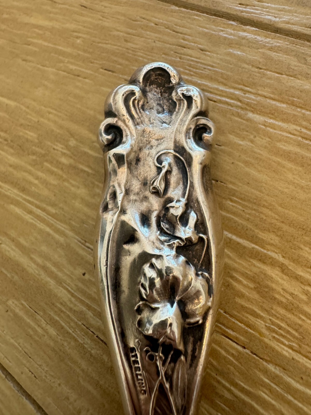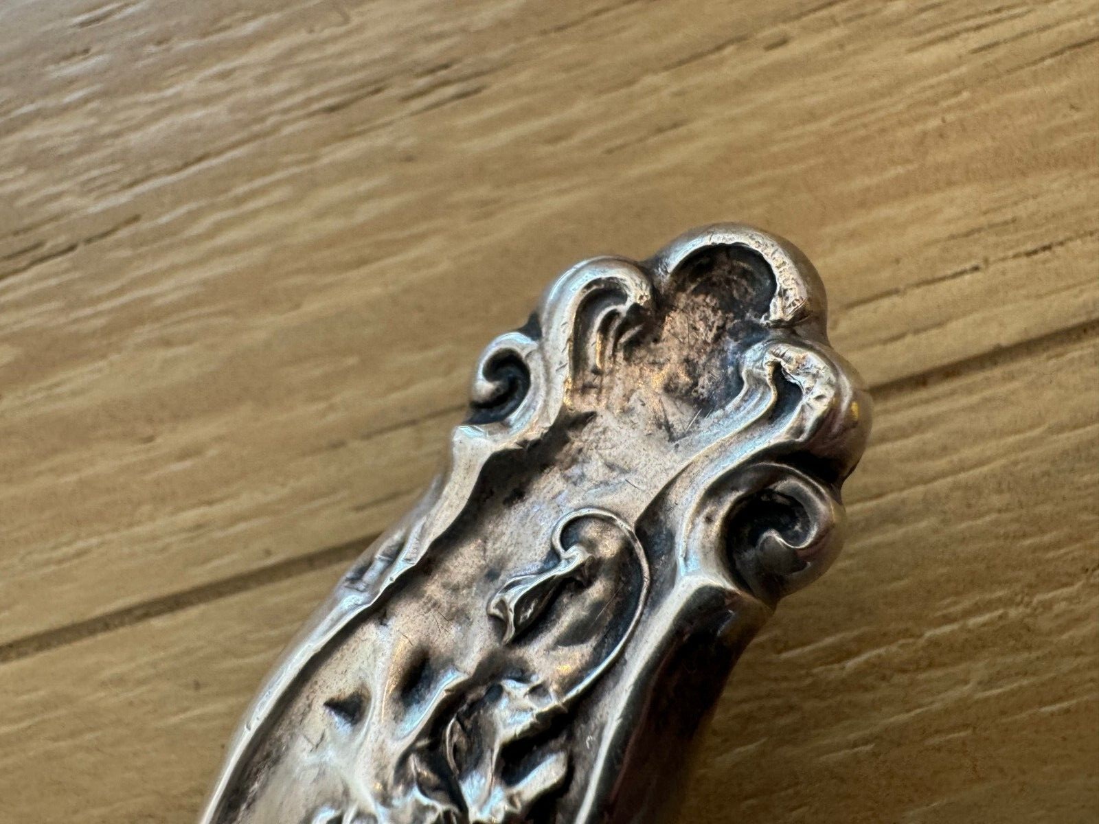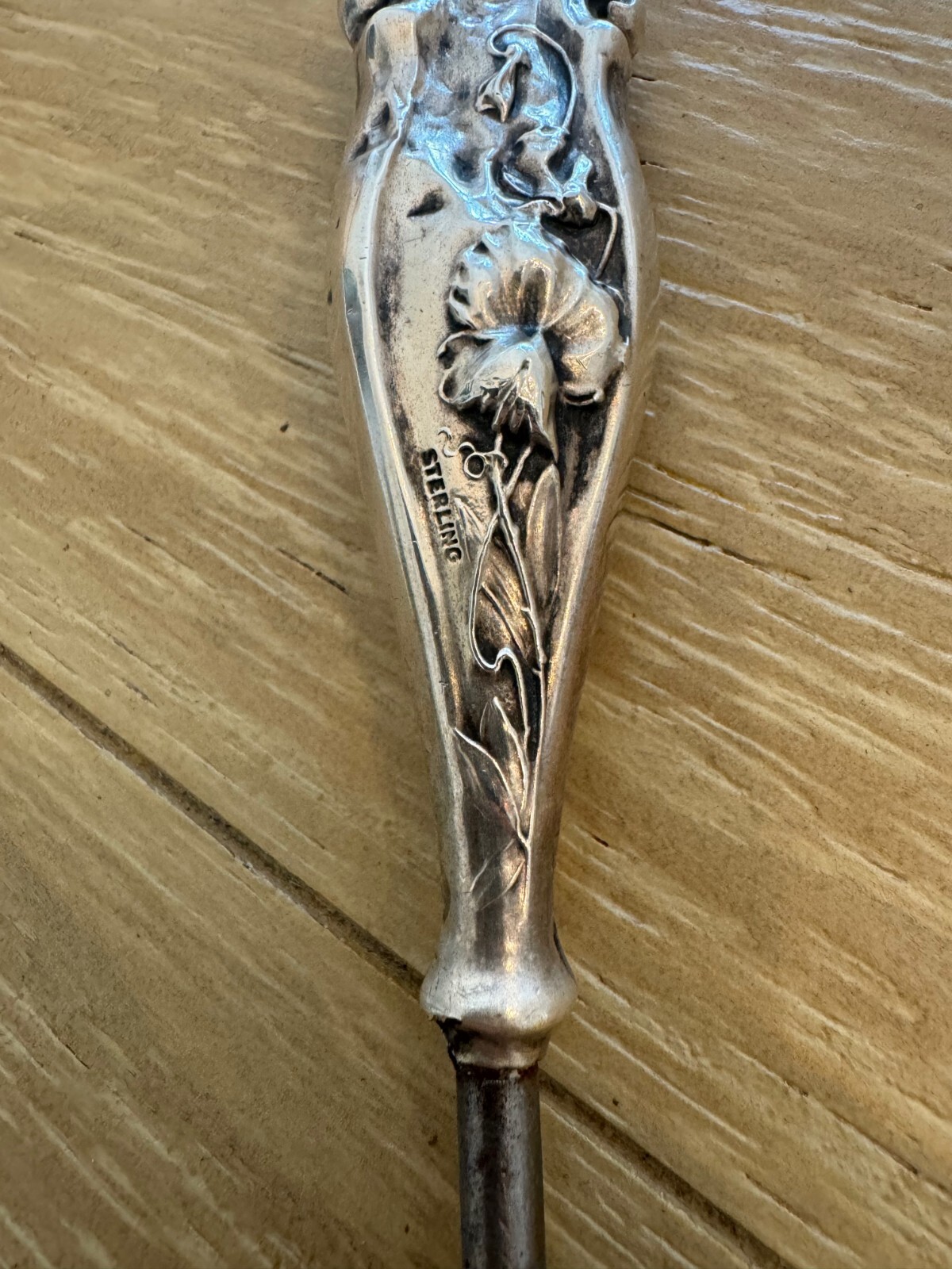 Antique Sterling Silver Handle Button Hook Art Nouveau Flower Design Monogram