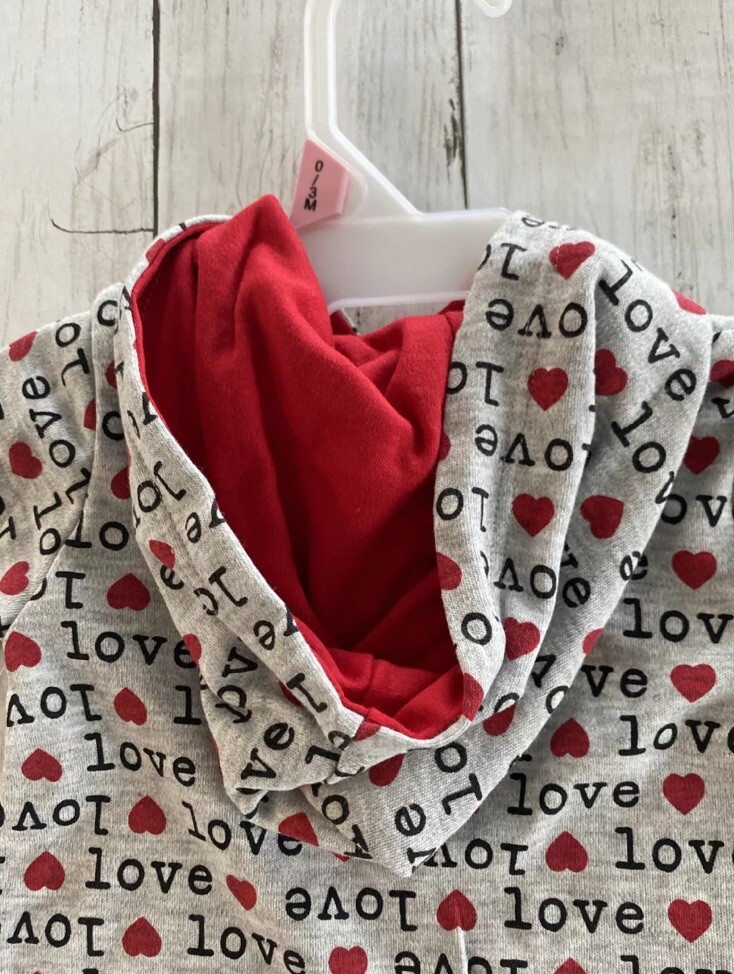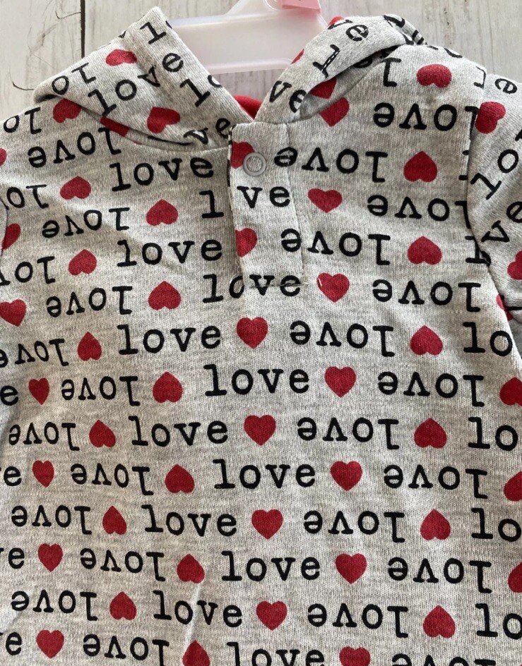Infant Boy Valentine Baby Gray Red with Hearts Love Hooded Romper 0-3 Months
