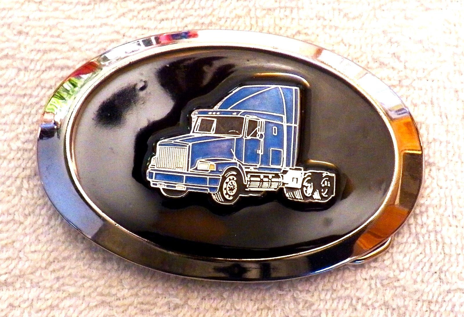 как выглядит CLASSIC BELT BUCKLE SEMI TRUCK LONG HAUL 18 WHEELER BLACK ENAMEL INLAY BLUE BB14 фото