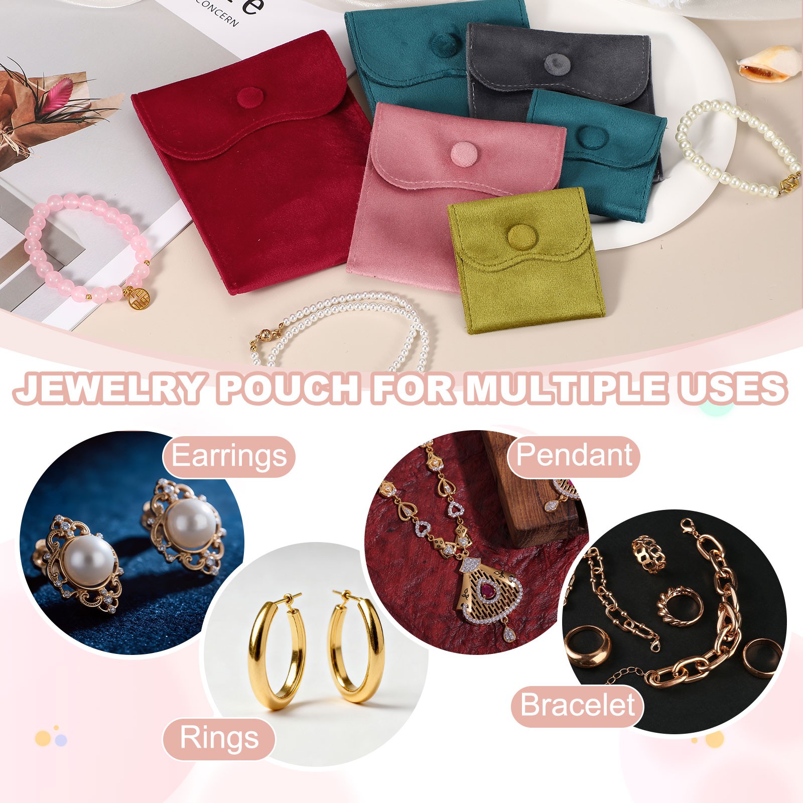2Pcs Velvet Jewelry Pouches with Snap Button 4 x 4 in Storage Bags, Grey