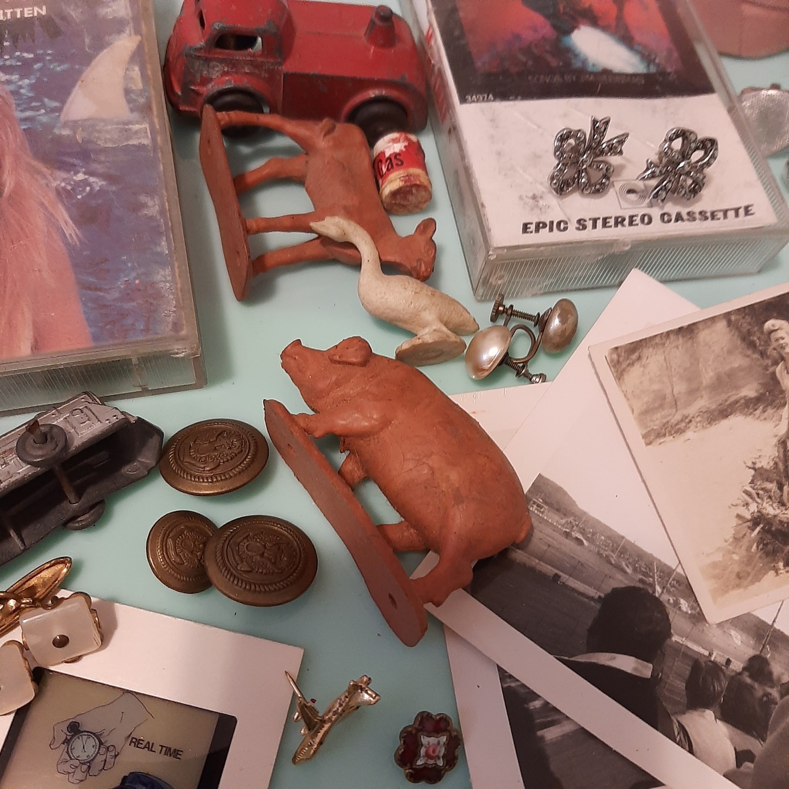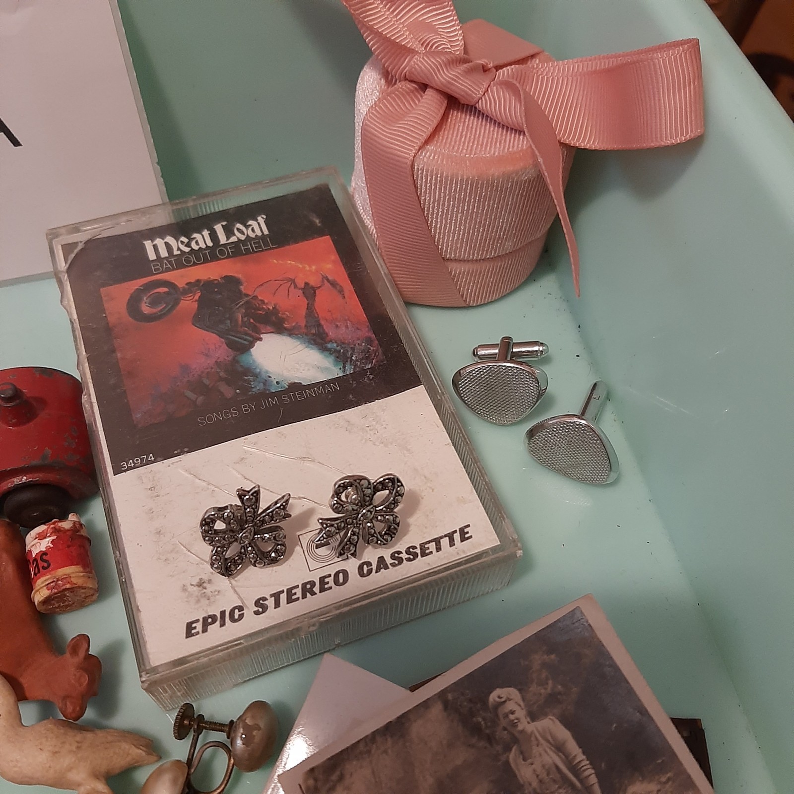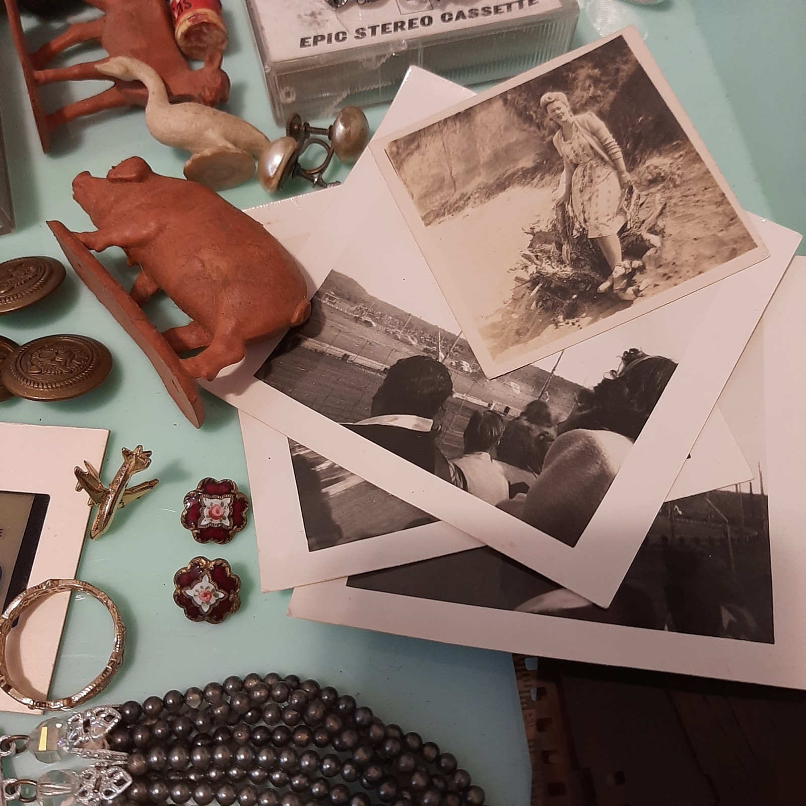 • Small JUNK DRAWER LOT A: Smalls Jewelry Trinkets Ephemera Cassette Tapes Buttons