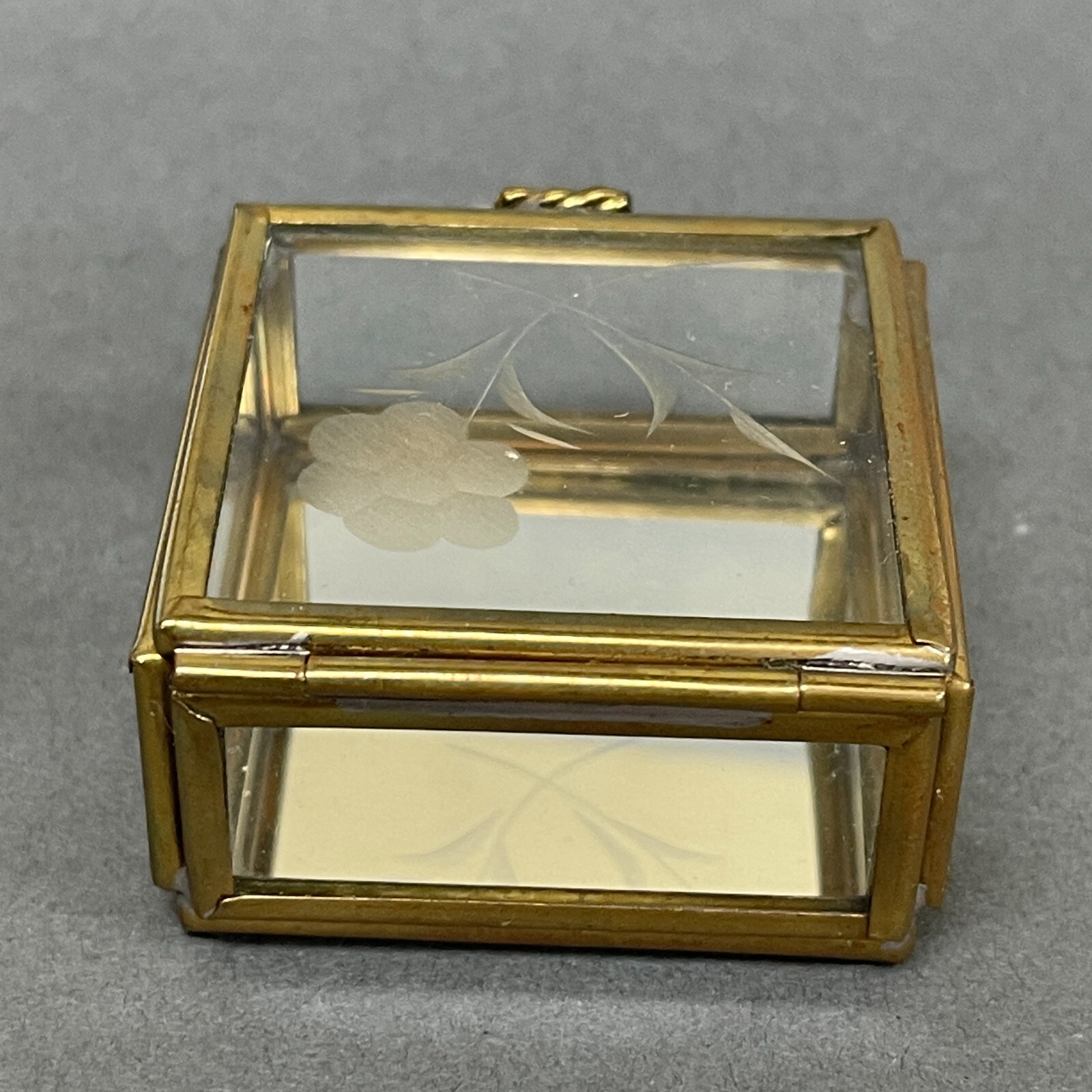 • Vintage Glass Brass Mirrored Small Jewelry Trinket Box Square with Flower