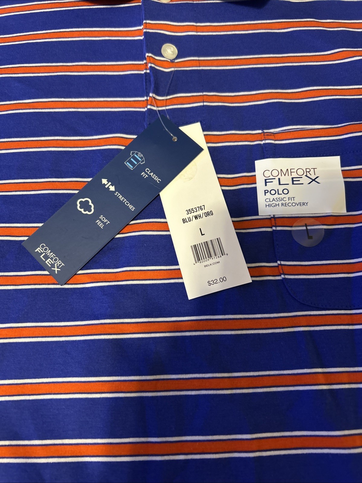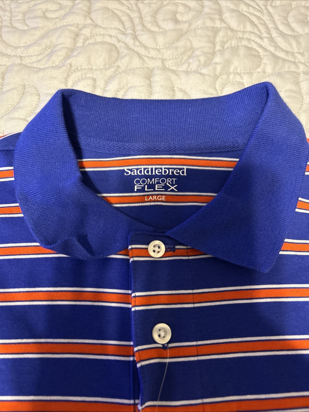 как выглядит Saddlebred Comfort Flex Mens Size L Blue Orange Striped Polo Shirt Short Sleeve фото
