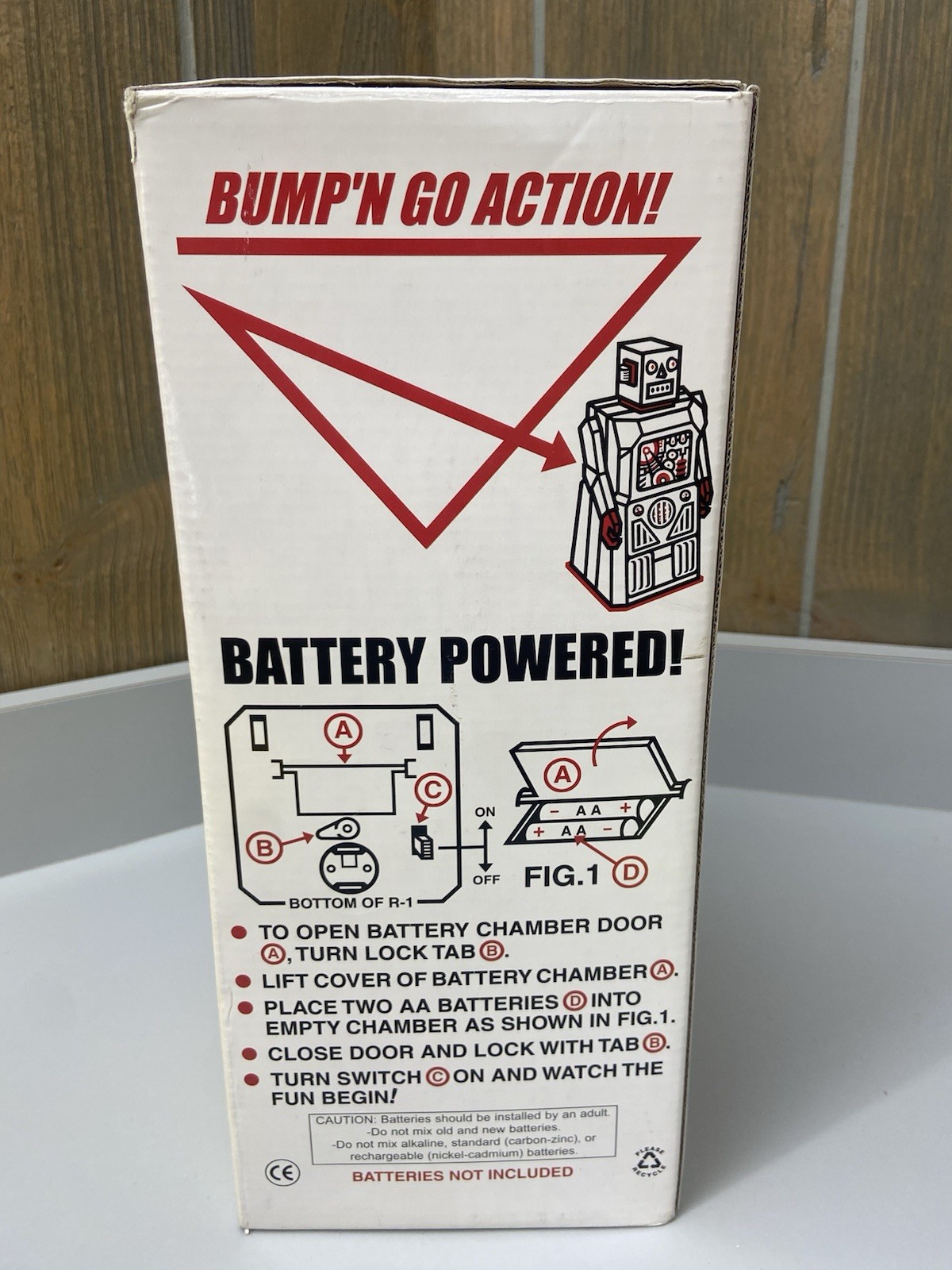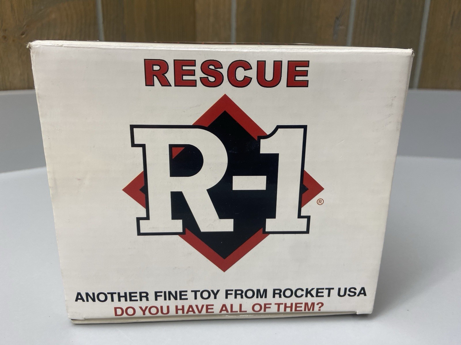 NIB Rescue R-1 Tin Metal Robot Toy Bump Go Battery Operated Rocket USA Yellow