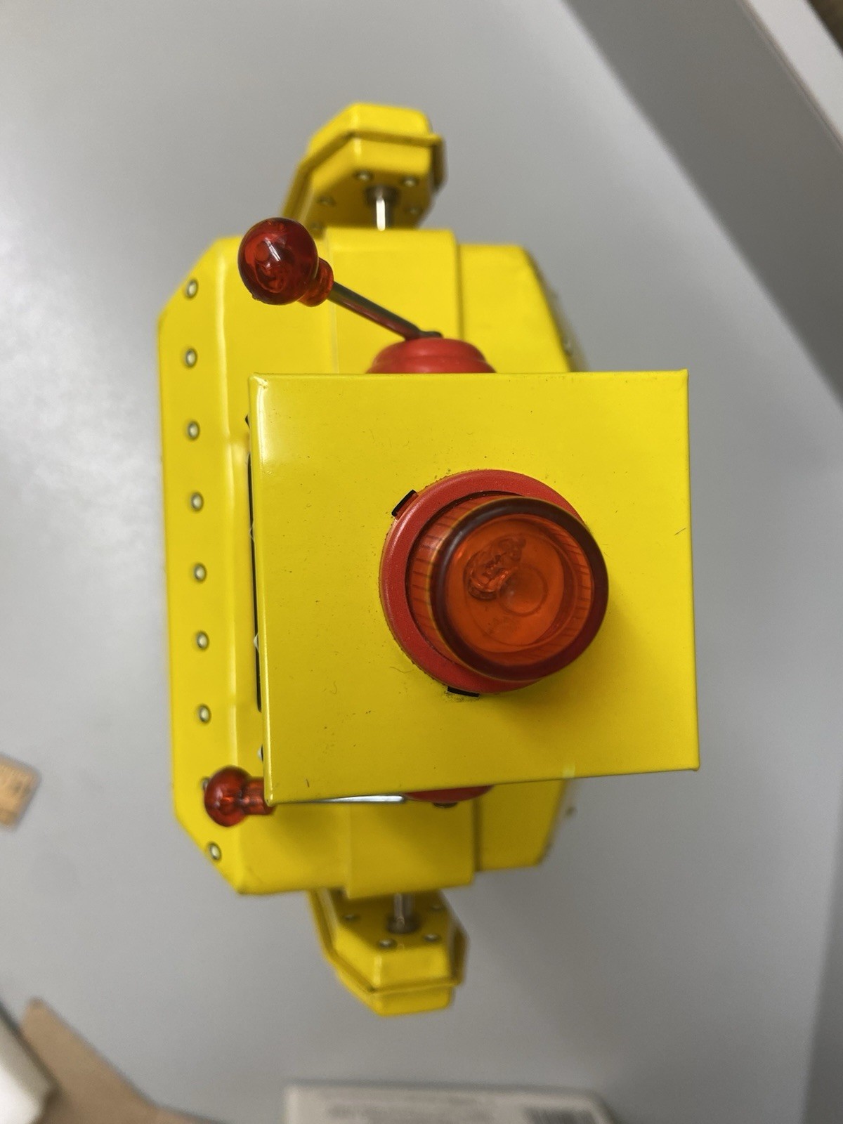как выглядит NIB Rescue R-1 Tin Metal Robot Toy Bump Go Battery Operated Rocket USA Yellow фото