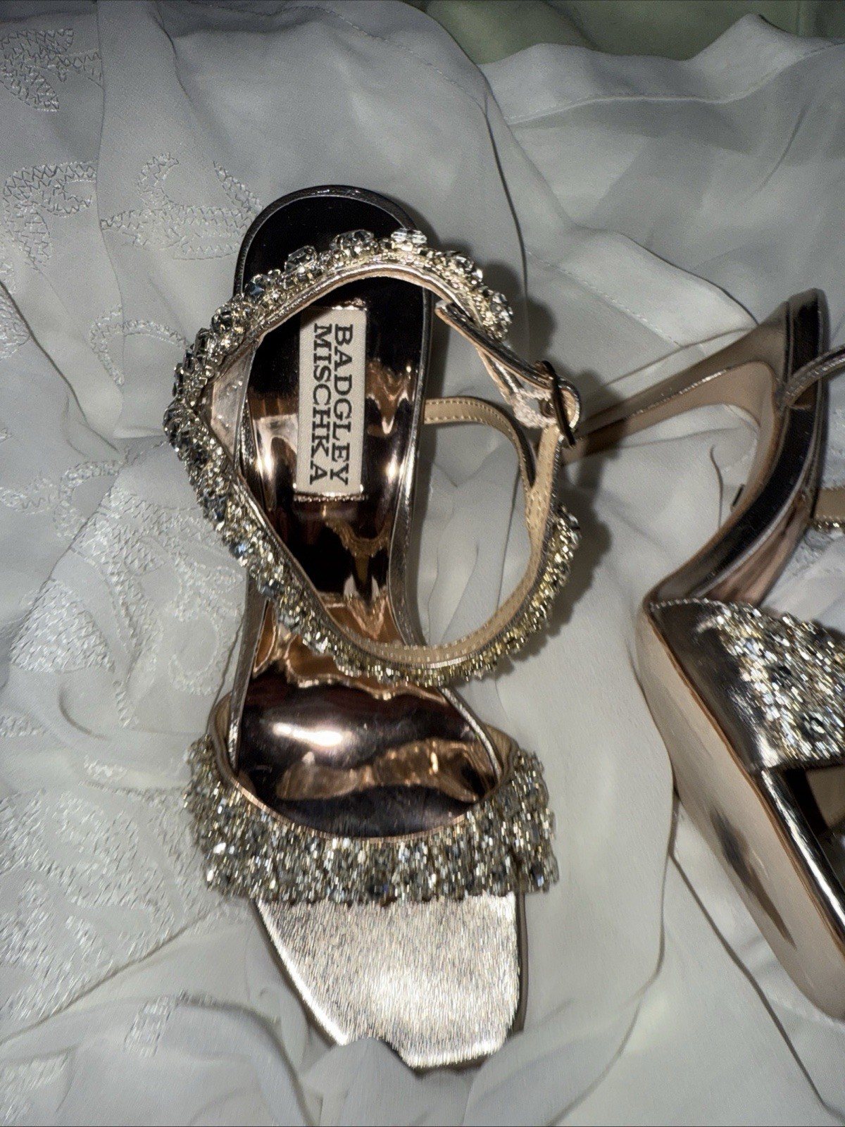 как выглядит Badgley Mischka Galia Champagne Metallic Jeweled Stiletto w/Ankle Strap Size 5.5 фото