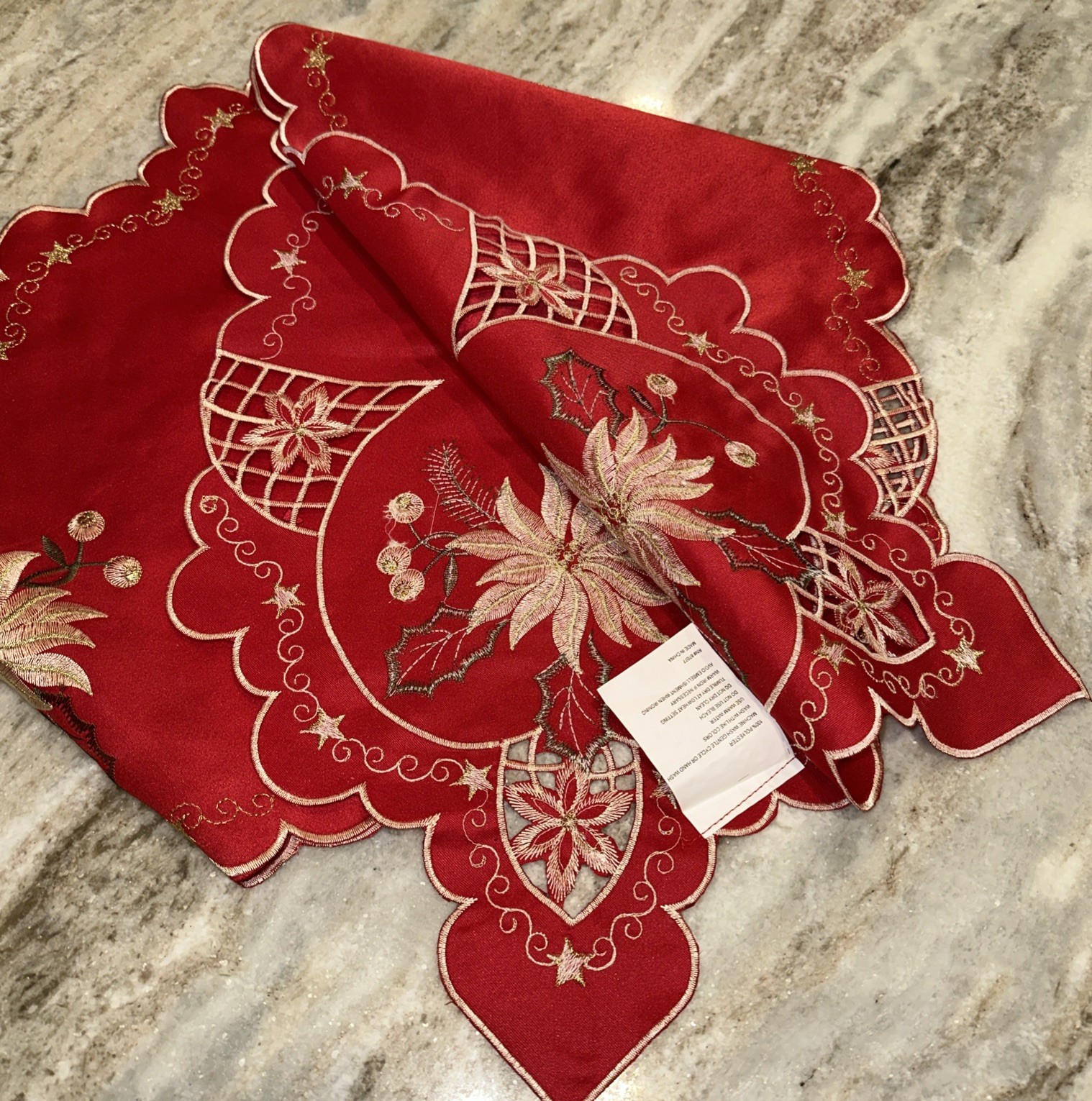 • Christmas Embroidered Table Runner Cut Work Poinsettia 13" x 68 Red Gold