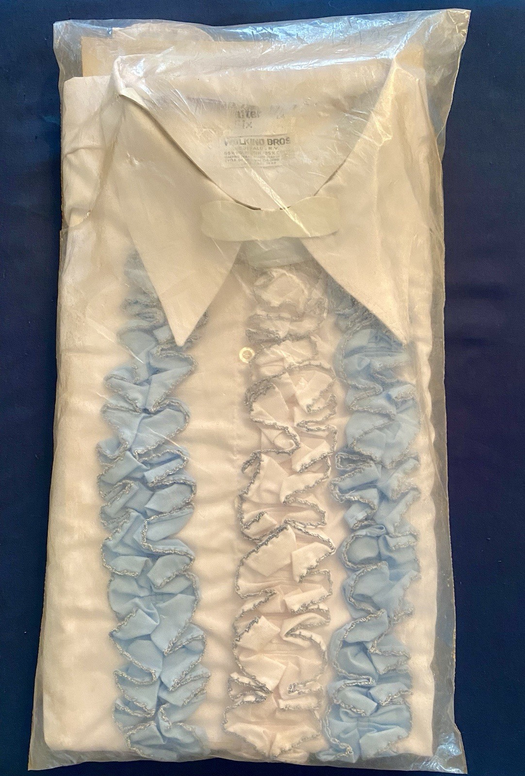 как выглядит Vtg NOS AFTER SIX Tuxedo Dress Shirt Ruffles Mens L4 White Blue Retro Prom 70s фото