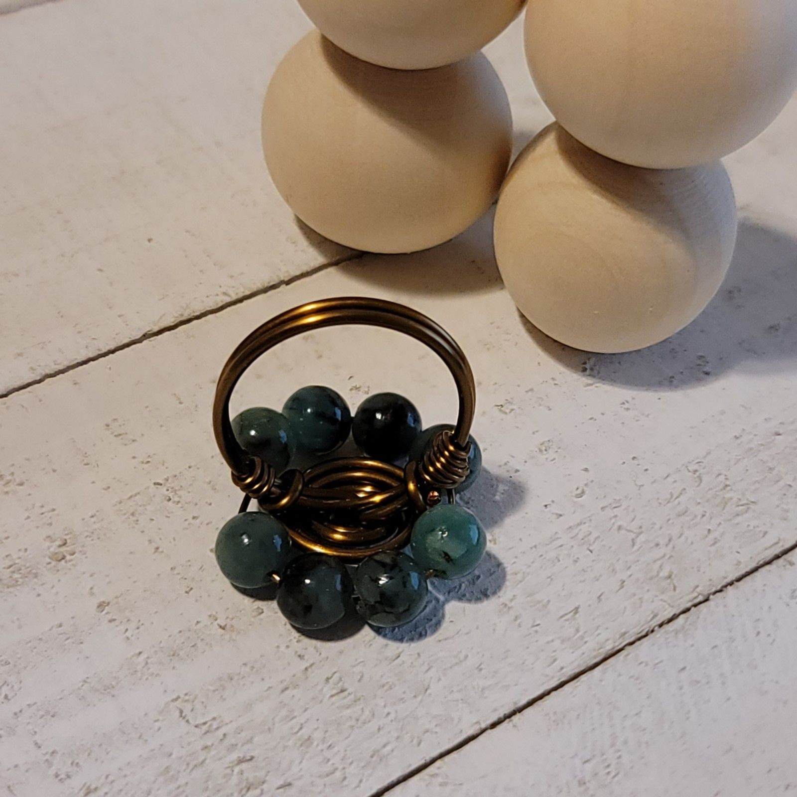 Handmade Copper Wire Wrapped Ring with Green Stone Beads Boho Adjustable