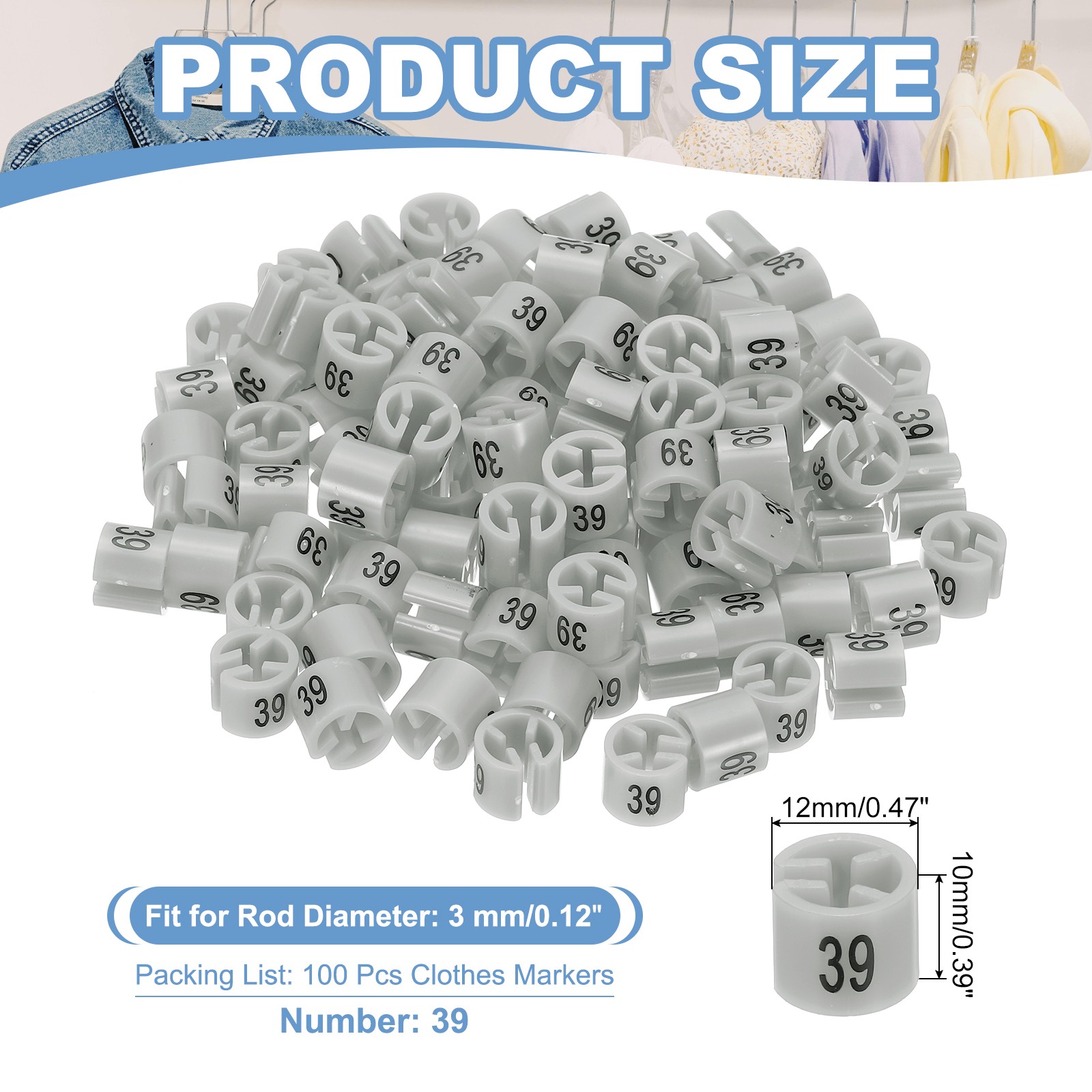 100 Pcs Clothes Hanger Marker Number 39 Tag Fit 3mm Rod Garment Size Tag Gray
