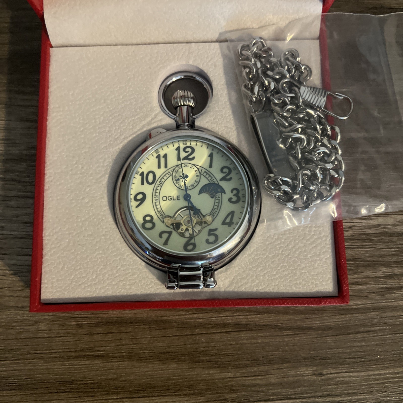 OGLE Automatic Skeleton Pocket Watch Silver Magnifier Luminous Self Winding