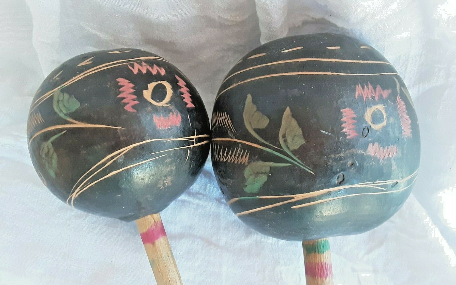 2 MARACAS HANDMADE CARVED PAINTED VINTAGE MUSICAL INSTRUMENTS SHAKERS PERCUSSION