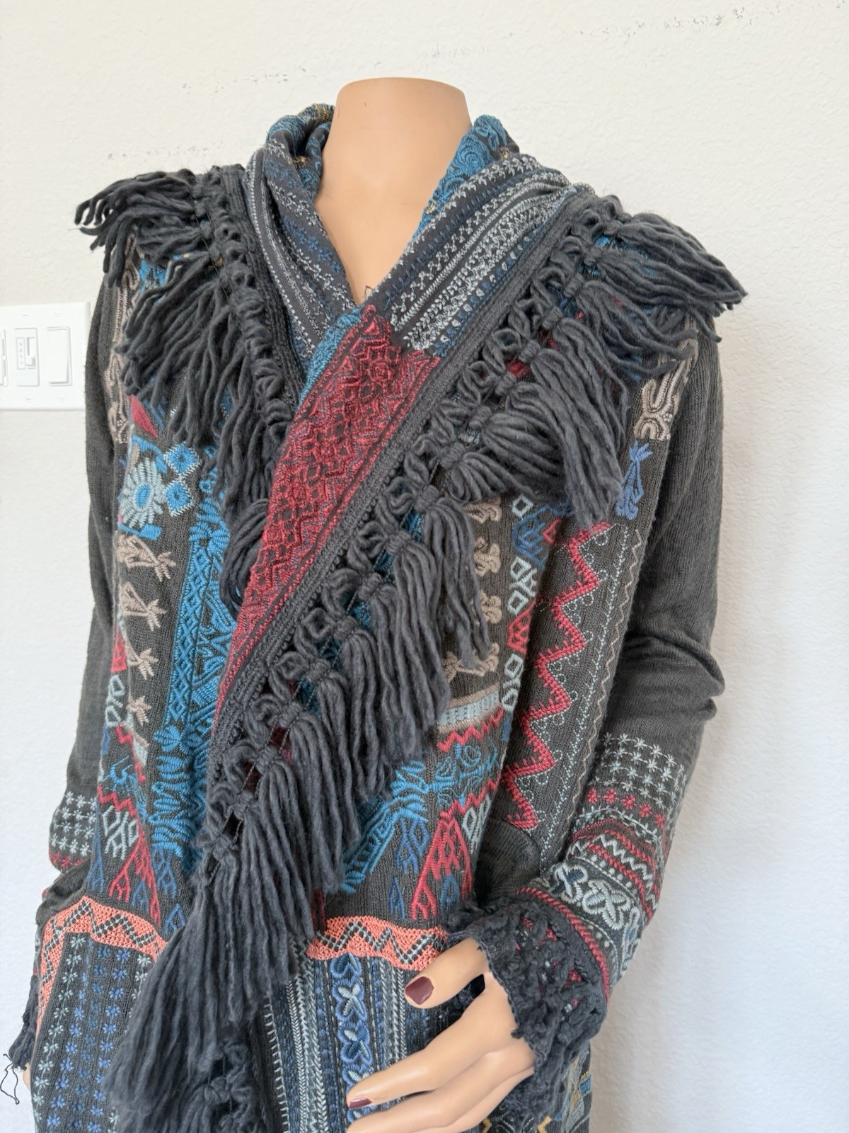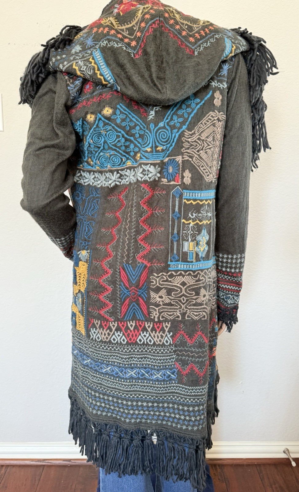Johnny Was BIYA Gray Butterfly Embroidered Fringed Hooded Duster Jacket Coat M