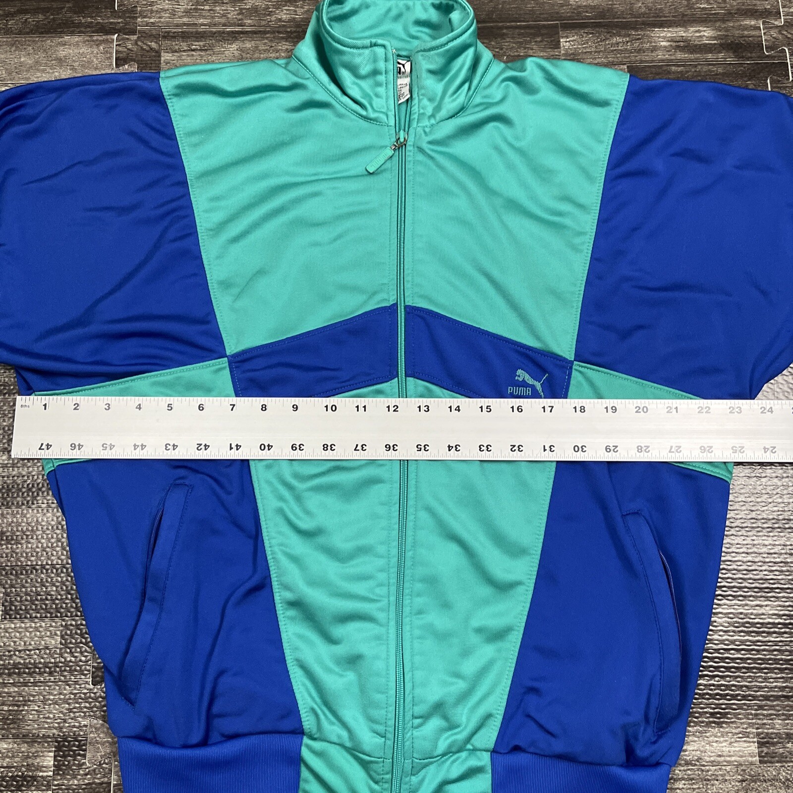 как выглядит Vintage 1980s PUMA Track Jacket Blue Green Geometric Medium VTG Casual Sports фото