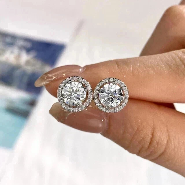 как выглядит 4 Ct Round Cut VVS1/D Lab Created Halo Womens Stud Earrings 14K White Gold 8mm фото