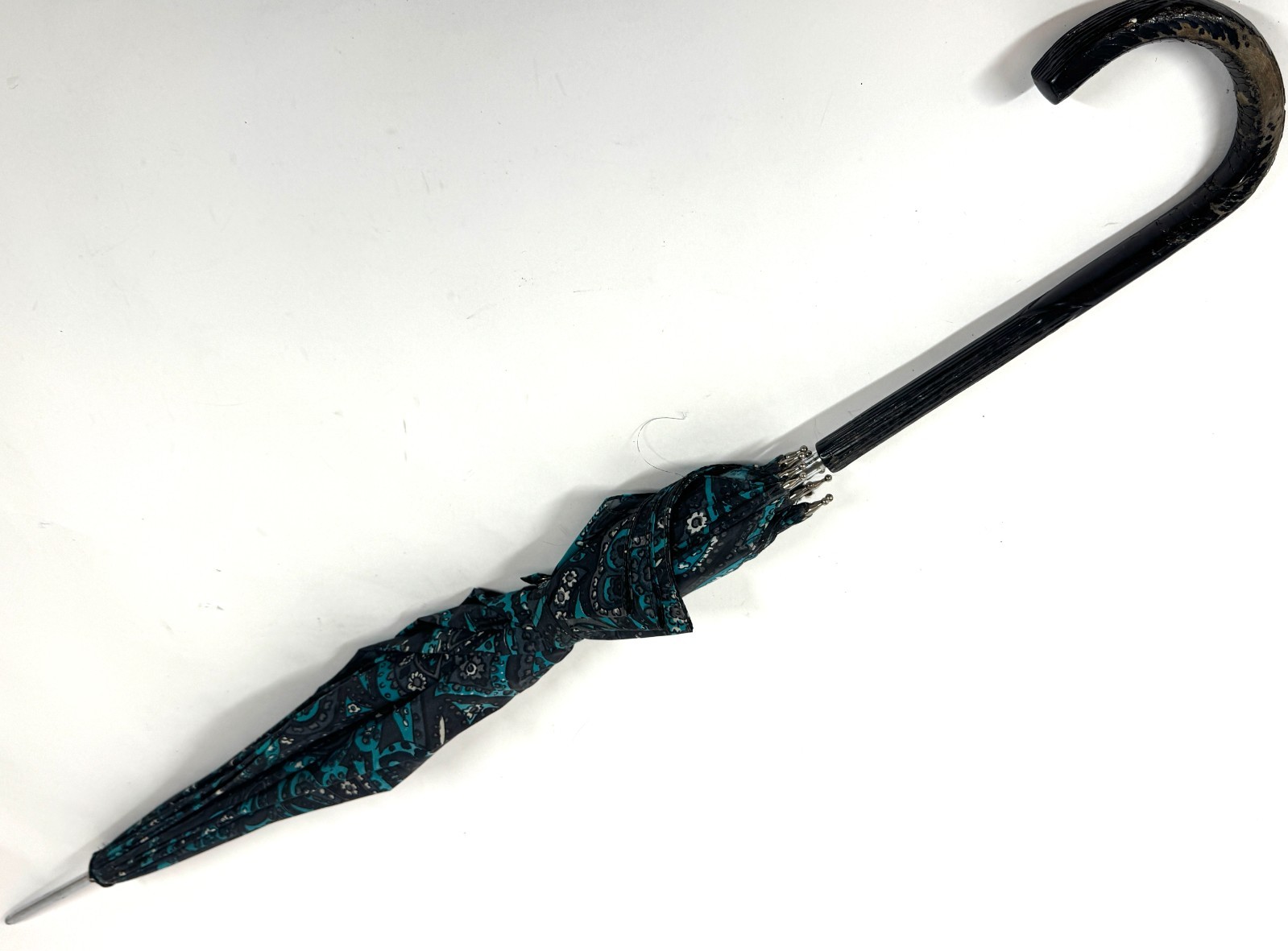 как выглядит Vintage Nylon 36" Wood Handle Teal Turquoise Paisley Umbrella Parisol WORKS фото