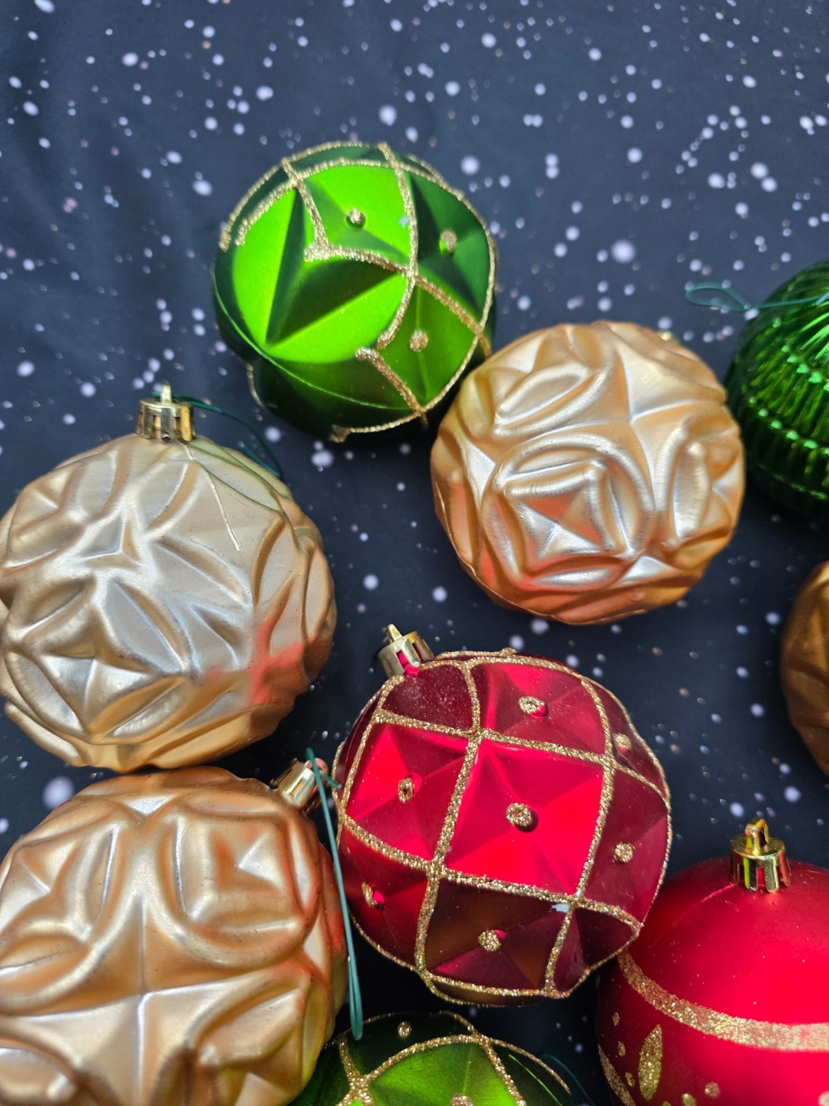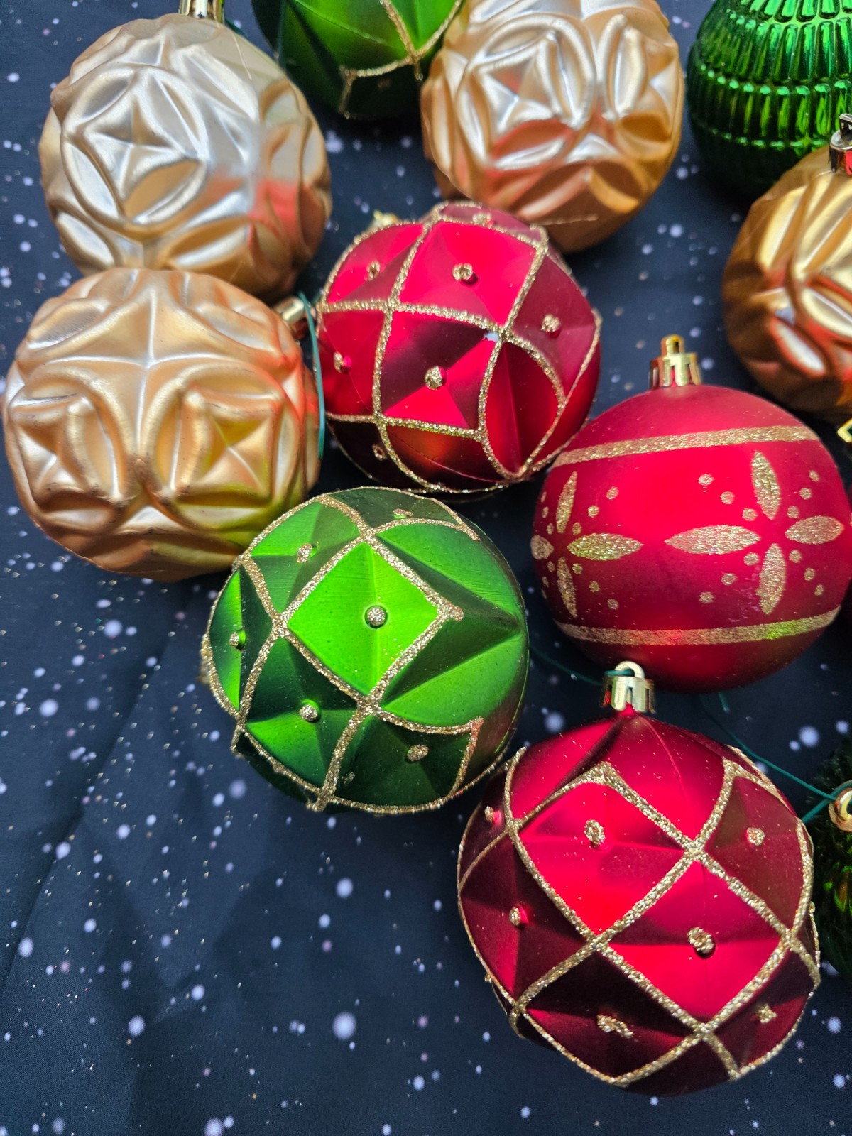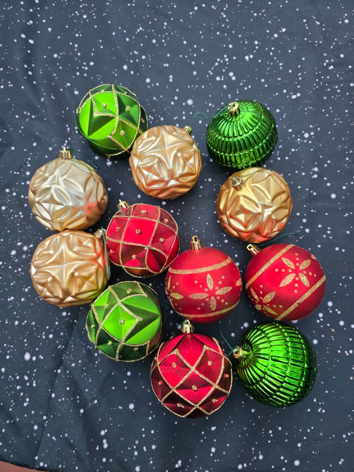 Особенности: 12 plastic shatterproof ornaments, 4 of each color. One red one has a small dent., 3" across