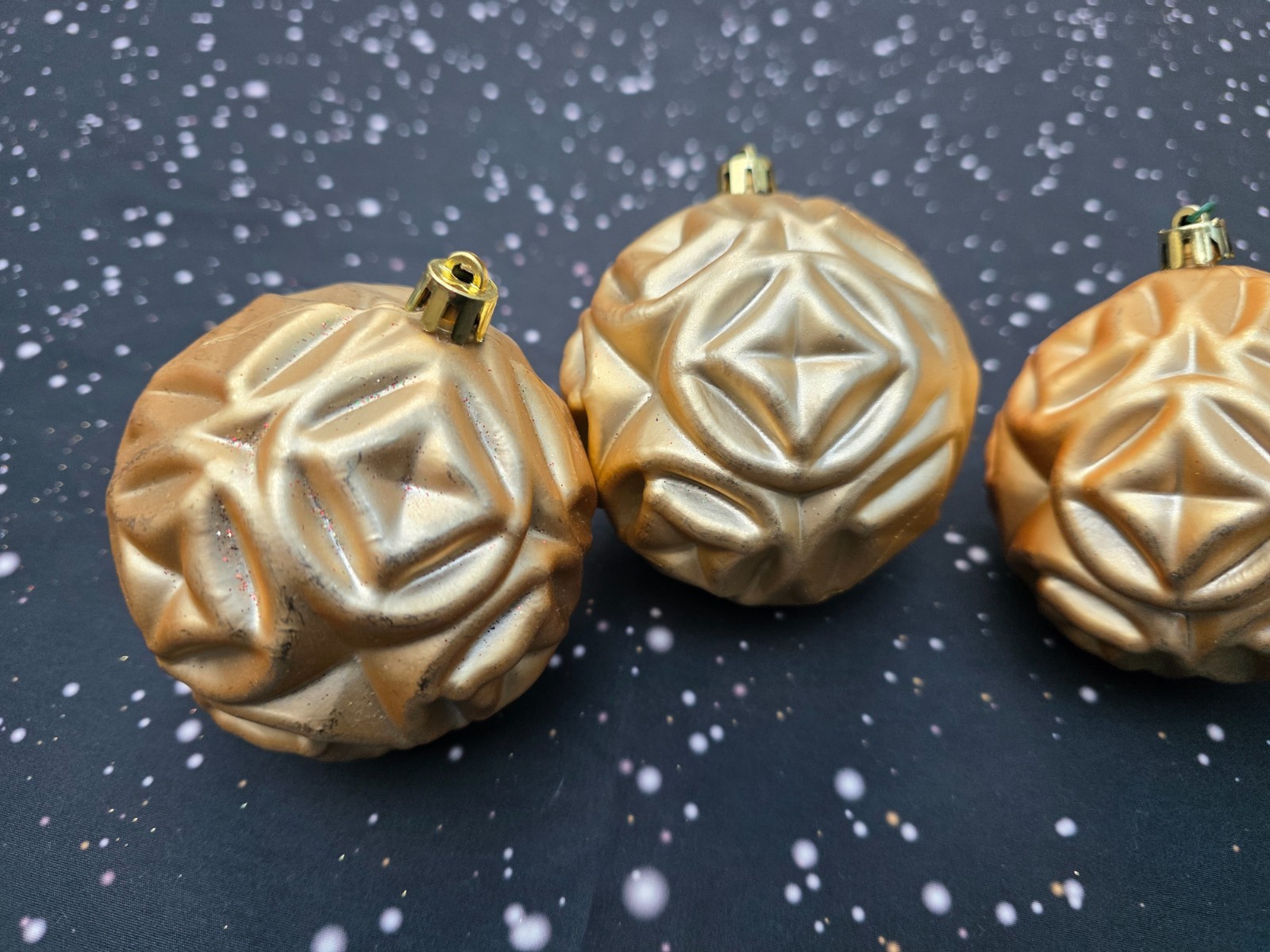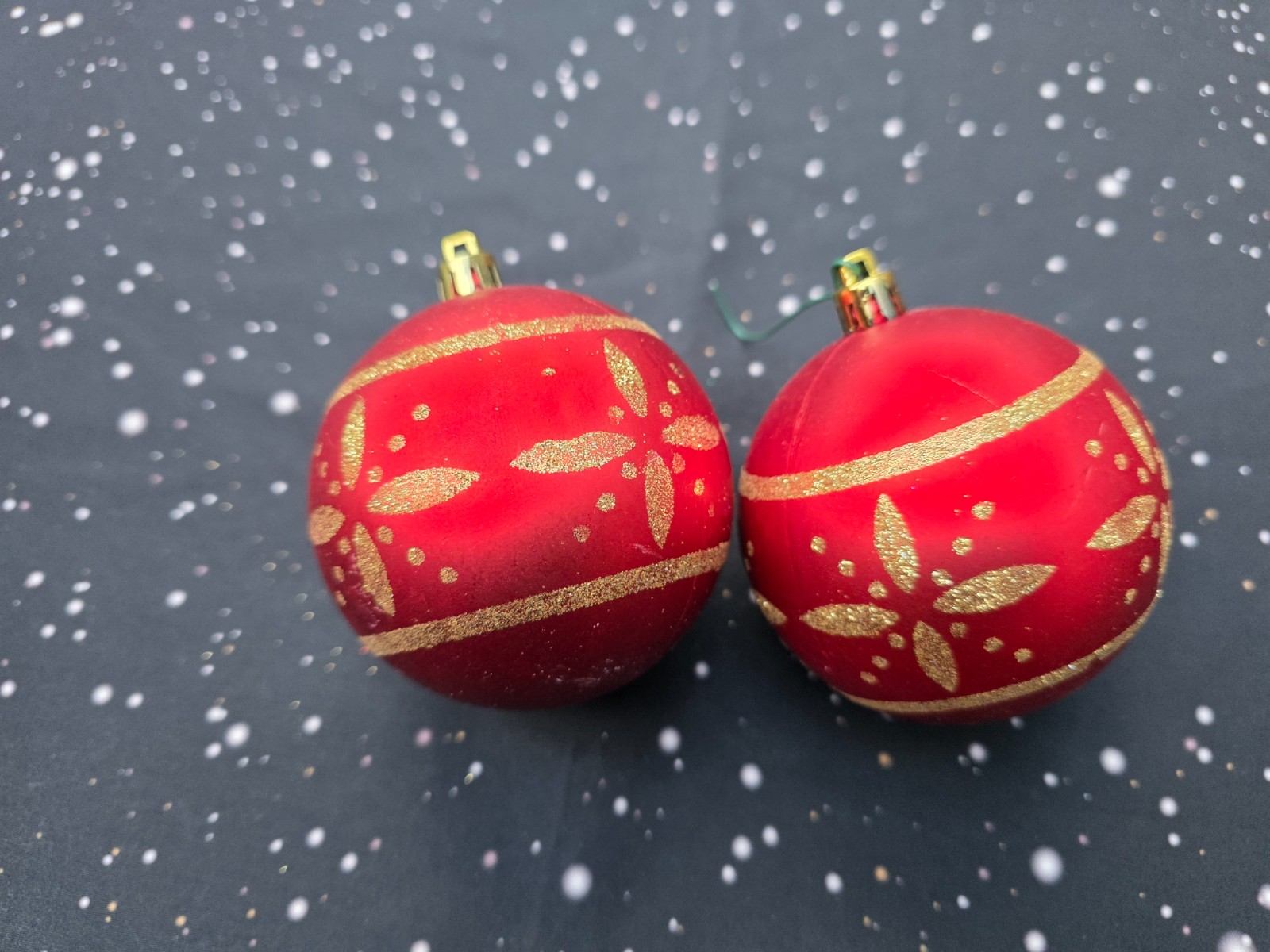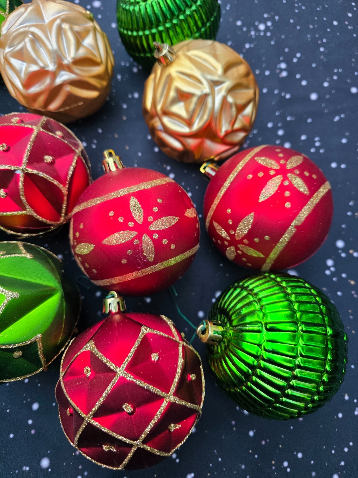 Особенности: 12 plastic shatterproof ornaments, 4 of each color. One red one has a small dent., 3" across