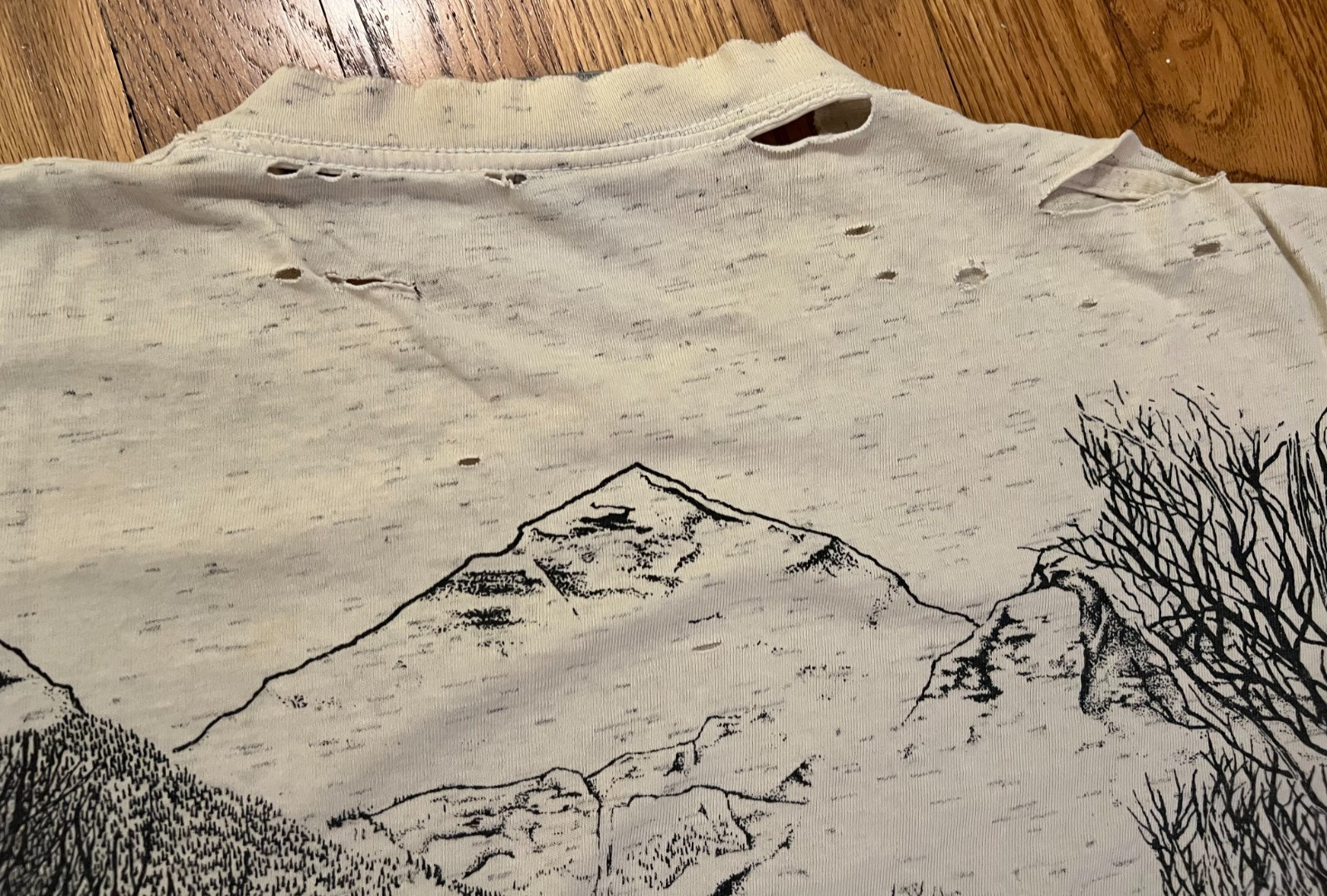 как выглядит VTG 90s Mountain Wolf Detailed AOP Shirt Sz Large Single Stitch Distressed Holes фото