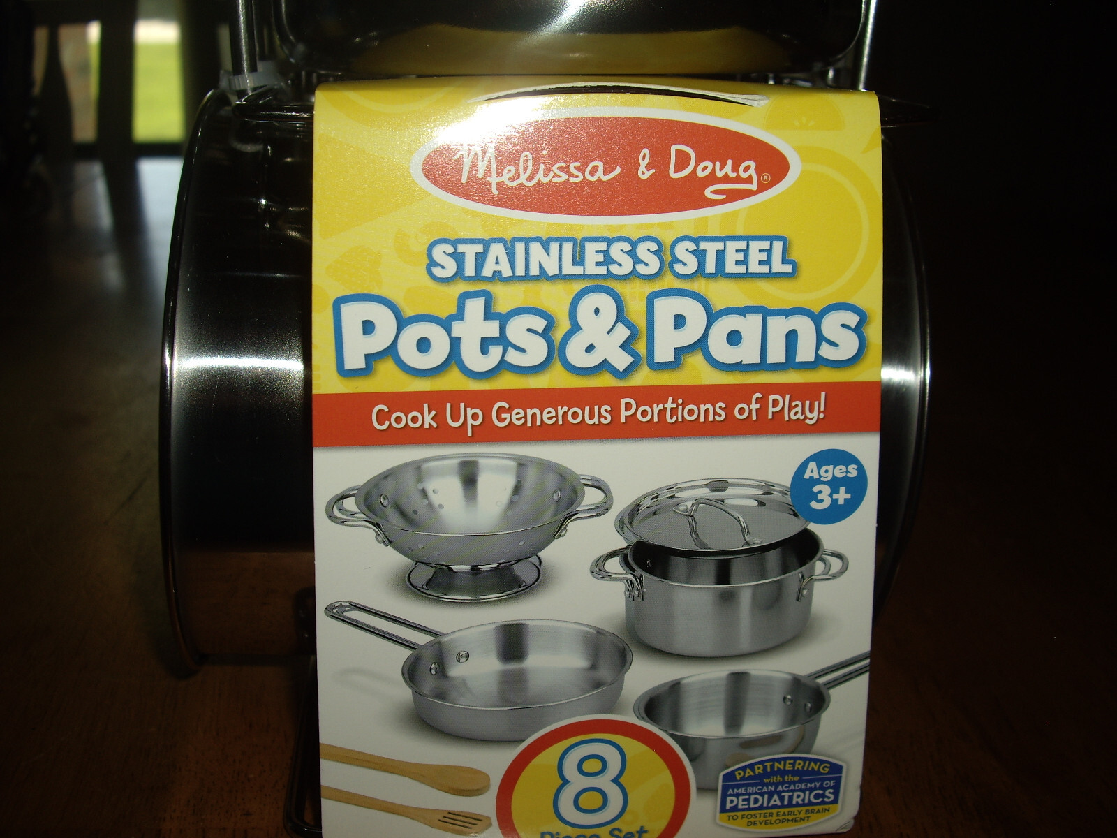 как выглядит NEW Melissa Doug Stainless Steel Pots Pans 8pc Set with Wood Spoons Rack фото