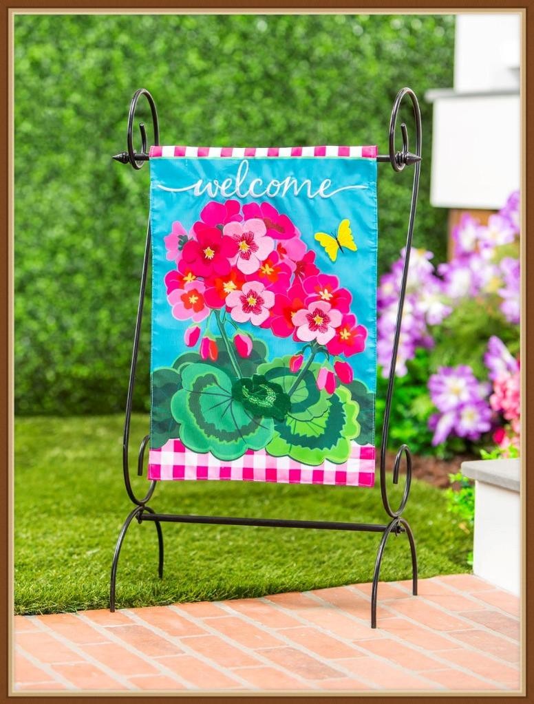 как выглядит EVERGREEN GARDEN FLAG WELCOME GERANIUMS EMBELISHED APPLIQUE - BRAND NEW фото
