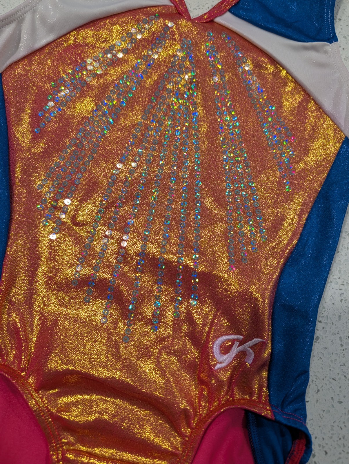 COMPETITION GK Elite Gymnastics Dance Leotard Large blue Orange SEQUIN Mystique