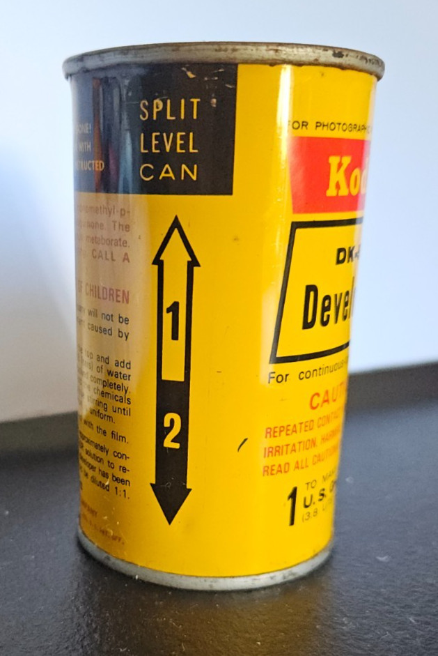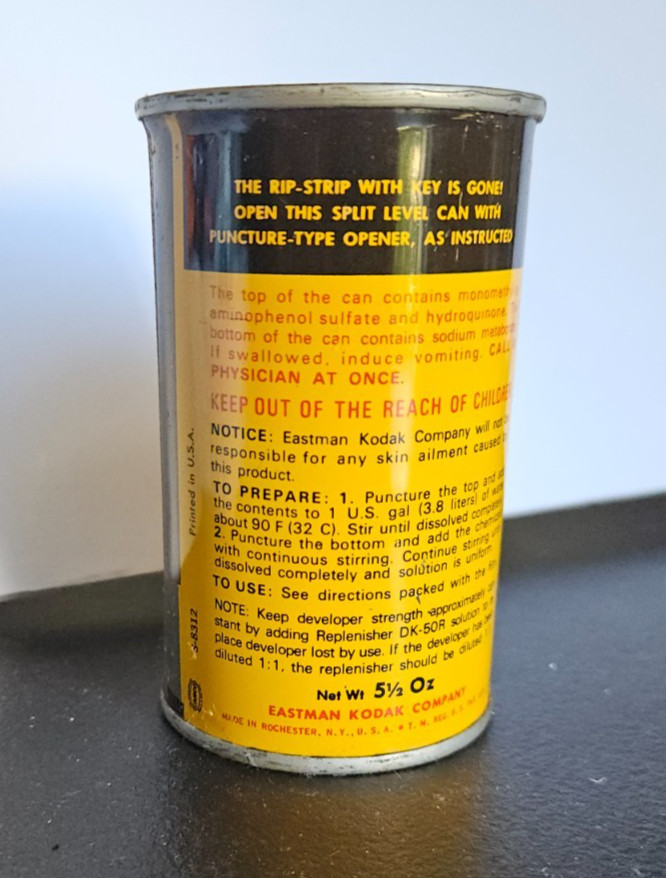 • KODAK. DK-50 DEVELOPER TO MAKE 1 U.S. GALLON. UNOPENED ADVERTISING TIN